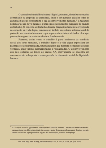 58Rev. Trib. Reg. Trab. 3ª Reg., Belo Horizonte, v. 71, n. 111, p. 33-58, jan./jun. 2025O conceito de trabalho decente (digno), portanto, sintetiza o conceito de trabalho ou emprego de qualidade, onde o ser humano goza de todas as garantias básicas e possibilita o seu desenvolvimento humano.28 Chegamos no limiar de um novo milênio, a uma síntese dos direitos humanos no mundo do trabalho. O conceito de trabalho decente (digno) justamente corresponde ao conceito de vida digna, cunhado no âmbito do sistema internacional de proteção aos direitos humanos e que representa a síntese de todos eles, que pressupõe o gozo de todos os direitos fundamentais.Portanto, assim como o trabalho é parte intrínseca da condição social dos seres humanos, o trabalho digno e a vida digna expressam um palimpsesto de humanidade, um manuscrito que permite o encontro de duas verdades, duas versões reinterpretadas e reinventadas. O desenvolvimento dos dois sistemas ao longo do século XX efetivamente se encontra em uma só versão sobreposta e reinterpretada da dimensão social da dignidade humana.28 As Nações Unidas igualmente começaram a utilizar o termo “desenvolvimento humano” para designar os diferentes níveis de acesso e gozo de uma ampla gama de direitos sociais, desde o acesso à água potável e esgoto até a educação, cultura e emprego.