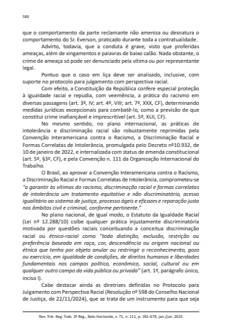 Rev. Trib. Reg. Trab. 3ª Reg., Belo Horizonte, v. 71, n. 111, p. 281-679, jan./jun. 2025586que o comportamento da parte reclamante não ameniza ou desnatura o comportamento do Sr. Everson, praticado durante toda a contratualidade.Advirto, todavia, que a conduta é grave, visto que proferidas ameaças, além de xingamentos e palavras de baixo calão. Nada obstante, o crime de ameaça só pode ser denunciado pela vítima ou por representante legal.Pontuo que o caso em liça deve ser analisado, inclusive, com suporte no protocolo para julgamento com perspectiva racial.Com efeito, a Constituição da República confere especial proteção à igualdade racial e repudia, com veemência, a prática do racismo em diversas passagens (art. 3º, IV; art. 4º, VIII; art. 7º, XXX, CF), determinando medidas jurídicas excepcionais para combatê-lo, como a previsão de que constitui crime inafiançável e imprescritível (art. 5º, XLII, CF).No mesmo sentido, no plano internacional, as práticas de intolerância e discriminação racial são robustamente reprimidas pela Convenção Interamericana contra o Racismo, a Discriminação Racial e Formas Correlatas de Intolerância, promulgada pelo Decreto nº10.932, de 10 de janeiro de 2022, e internalizada com status de emenda constitucional (art. 5º, §3º, CF), e pela Convenção n. 111 da Organização Internacional do Trabalho.O Brasil, ao aprovar a Convenção Interamericana contra o Racismo, a Discriminação Racial e Formas Correlatas de Intolerância, comprometeu-se “a garantir às vítimas do racismo, discriminação racial e formas correlatas de intolerância um tratamento equitativo e não discriminatório, acesso igualitário ao sistema de justiça, processo ágeis e eficazes e reparação justa nos âmbitos civil e criminal, conforme pertinente.”No plano nacional, de igual modo, o Estatuto da Igualdade Racial (Lei nº 12.288/10) coíbe qualquer prática injustamente discriminatória motivada por questões raciais conceituando a conceitua discriminação racial ou étnico-racial como “toda distinção, exclusão, restrição ou preferência baseada em raça, cor, descendência ou origem nacional ou étnica que tenha por objeto anular ou restringir o reconhecimento, gozo ou exercício, em igualdade de condições, de direitos humanos e liberdades fundamentais nos campos político, econômico, social, cultural ou em qualquer outro campo da vida pública ou privada” (art. 1º, parágrafo único,inciso I).Cabe destacar ainda as diretrizes definidas no Protocolo para Julgamento com Perspectiva Racial (Resolução nº 598 do Conselho Nacional de Justiça, de 22/11/2024), que se trata de um instrumento para que seja