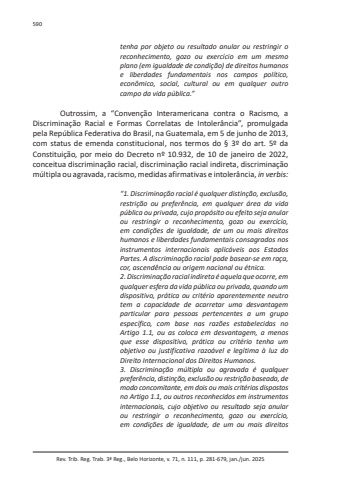 Rev. Trib. Reg. Trab. 3ª Reg., Belo Horizonte, v. 71, n. 111, p. 281-679, jan./jun. 2025590tenha por objeto ou resultado anular ou restringir o reconhecimento, gozo ou exercício em um mesmo plano (em igualdade de condição) de direitos humanos e liberdades fundamentais nos campos político, econômico, social, cultural ou em qualquer outro campo da vida pública.”Outrossim, a “Convenção Interamericana contra o Racismo, a Discriminação Racial e Formas Correlatas de Intolerância”, promulgada pela República Federativa do Brasil, na Guatemala, em 5 de junho de 2013, com status de emenda constitucional, nos termos do § 3º do art. 5º da Constituição, por meio do Decreto nº 10.932, de 10 de janeiro de 2022, conceitua discriminação racial, discriminação racial indireta, discriminação múltipla ou agravada, racismo, medidas afirmativas e intolerância, in verbis:“1. Discriminação racial é qualquer distinção, exclusão, restrição ou preferência, em qualquer área da vida pública ou privada, cujo propósito ou efeito seja anular ou restringir o reconhecimento, gozo ou exercício, em condições de igualdade, de um ou mais direitos humanos e liberdades fundamentais consagrados nos instrumentos internacionais aplicáveis aos Estados Partes. A discriminação racial pode basear-se em raça, cor, ascendência ou origem nacional ou étnica.2. Discriminação racial indireta é aquela que ocorre, em qualquer esfera da vida pública ou privada, quando um dispositivo, prática ou critério aparentemente neutro tem a capacidade de acarretar uma desvantagem particular para pessoas pertencentes a um grupo específico, com base nas razões estabelecidas no Artigo 1.1, ou as coloca em desvantagem, a menos que esse dispositivo, prática ou critério tenha um objetivo ou justificativa razoável e legítima à luz do Direito Internacional dos Direitos Humanos.3. Discriminação múltipla ou agravada é qualquer preferência, distinção, exclusão ou restrição baseada, de modo concomitante, em dois ou mais critérios dispostos no Artigo 1.1, ou outros reconhecidos em instrumentos internacionais, cujo objetivo ou resultado seja anular ou restringir o reconhecimento, gozo ou exercício, em condições de igualdade, de um ou mais direitos