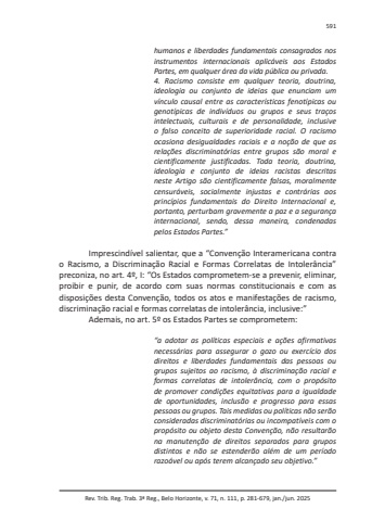 Rev. Trib. Reg. Trab. 3ª Reg., Belo Horizonte, v. 71, n. 111, p. 281-679, jan./jun. 2025591humanos e liberdades fundamentais consagrados nos instrumentos internacionais aplicáveis aos Estados Partes, em qualquer área da vida pública ou privada.4. Racismo consiste em qualquer teoria, doutrina, ideologia ou conjunto de ideias que enunciam um vínculo causal entre as características fenotípicas ou genotípicas de indivíduos ou grupos e seus traços intelectuais, culturais e de personalidade, inclusive o falso conceito de superioridade racial. O racismo ocasiona desigualdades raciais e a noção de que as relações discriminatórias entre grupos são moral e cientificamente justificadas. Toda teoria, doutrina, ideologia e conjunto de ideias racistas descritas neste Artigo são cientificamente falsas, moralmente censuráveis, socialmente injustas e contrárias aos princípios fundamentais do Direito Internacional e, portanto, perturbam gravemente a paz e a segurança internacional, sendo, dessa maneira, condenadas pelos Estados Partes.”Imprescindível salientar, que a “Convenção Interamericana contra o Racismo, a Discriminação Racial e Formas Correlatas de Intolerância” preconiza, no art. 4º, I: “Os Estados comprometem-se a prevenir, eliminar, proibir e punir, de acordo com suas normas constitucionais e com as disposições desta Convenção, todos os atos e manifestações de racismo, discriminação racial e formas correlatas de intolerância, inclusive:”Ademais, no art. 5º os Estados Partes se comprometem:“a adotar as políticas especiais e ações afirmativas necessárias para assegurar o gozo ou exercício dos direitos e liberdades fundamentais das pessoas ou grupos sujeitos ao racismo, à discriminação racial e formas correlatas de intolerância, com o propósito de promover condições equitativas para a igualdade de oportunidades, inclusão e progresso para essas pessoas ou grupos. Tais medidas ou políticas não serão consideradas discriminatórias ou incompatíveis com o propósito ou objeto desta Convenção, não resultarão na manutenção de direitos separados para grupos distintos e não se estenderão além de um período razoável ou após terem alcançado seu objetivo.”