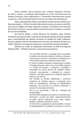 Rev. Trib. Reg. Trab. 3ª Reg., Belo Horizonte, v. 71, n. 111, p. 281-679, jan./jun. 2025592Nesse sentido, não se descura que o Brasil, enquanto membro da OEA e sujeito à jurisdição internacional da Corte Interamericana de Direitos Humanos, deve observância à “Convenção Interamericana contra o Racismo, a Discriminação Racial e Formas Correlatas de Intolerância”.Sob a inspiração dos valores e princípios constitucionais, destaca-se a Recomendação n. 123 do Conselho Nacional de Justiça, de janeiro de 2022, que insta os órgãos do Poder Judiciário a aplicar os tratados internacionais de direitos humanos, a jurisprudência interamericana e a realizar o controle de convencionalidade.Na mesma alheta, o Pacto Nacional do Judiciário pelos Direitos Humanos, de março de 2022, consiste na adoção de medidas variadas voltadas para a concretização dos direitos humanos no âmbito do Poder Judiciário. Tem por objetivo central o fortalecimento da cultura de direitos humanos no Poder Judiciário, com especial enfoque no controle de convencionalidade.Salienta-se, ainda, as disposições declinadas no ODS 8 da Agenda 2030 da ONU - Trabalho decente e crescimento econômico:“8.5 Até 2030, alcançar o emprego pleno e produtivo e trabalho decente para todas as mulheres e homens, inclusive para os jovens e as pessoas com deficiência, e remuneração igual para trabalho de igual valor8.7 Tomar medidas imediatas e eficazes para erradicar o trabalho forçado, acabar com a escravidão moderna e o tráfico de pessoas, e assegurar a proibição e eliminação das piores formas de trabalho infantil, incluindo recrutamento e utilização de criançassoldado, e até 2025 acabar com o trabalho infantil em todas as suas formas8.8 Proteger os direitos trabalhistas e promover ambientes de trabalho seguros e protegidos para todos os trabalhadores, incluindo os trabalhadores migrantes, em particular as mulheres migrantes, e pessoas em empregos precáriosCita-se, por importante, o ODS 10 - Redução das desigualdades:10.2 Até 2030, empoderar e promover a inclusão social, econômica e política de todos, independentemente da idade, gênero, deficiência, raça, etnia, origem, religião, condição econômica ou outra10.3 Garantir a igualdade de oportunidades e reduzir as desigualdades de resultados, inclusive por meio da
