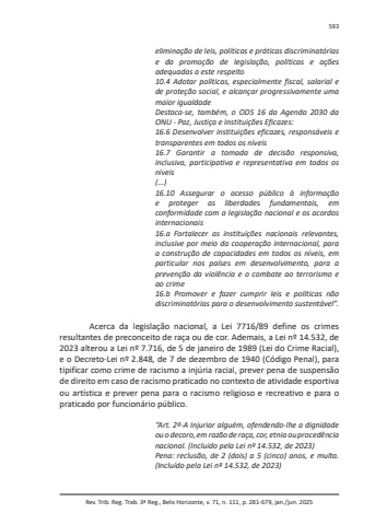 Rev. Trib. Reg. Trab. 3ª Reg., Belo Horizonte, v. 71, n. 111, p. 281-679, jan./jun. 2025593eliminação de leis, políticas e práticas discriminatórias e da promoção de legislação, políticas e ações adequadas a este respeito10.4 Adotar políticas, especialmente fiscal, salarial e de proteção social, e alcançar progressivamente uma maior igualdadeDestaca-se, também, o ODS 16 da Agenda 2030 da ONU - Paz, Justiça e Instituições Eficazes:16.6 Desenvolver instituições eficazes, responsáveis e transparentes em todos os níveis16.7 Garantir a tomada de decisão responsiva, inclusiva, participativa e representativa em todos os níveis(...)16.10 Assegurar o acesso público à informação e proteger as liberdades fundamentais, em conformidade com a legislação nacional e os acordos internacionais16.a Fortalecer as instituições nacionais relevantes, inclusive por meio da cooperação internacional, para a construção de capacidades em todos os níveis, em particular nos países em desenvolvimento, para a prevenção da violência e o combate ao terrorismo e ao crime16.b Promover e fazer cumprir leis e políticas não discriminatórias para o desenvolvimento sustentável”.Acerca da legislação nacional, a Lei 7716/89 define os crimes resultantes de preconceito de raça ou de cor. Ademais, a Lei nº 14.532, de 2023 alterou a Lei nº 7.716, de 5 de janeiro de 1989 (Lei do Crime Racial), e o Decreto-Lei nº 2.848, de 7 de dezembro de 1940 (Código Penal), para tipificar como crime de racismo a injúria racial, prever pena de suspensão de direito em caso de racismo praticado no contexto de atividade esportiva ou artística e prever pena para o racismo religioso e recreativo e para o praticado por funcionário público.“Art. 2º-A Injuriar alguém, ofendendo-lhe a dignidade ou o decoro, em razão de raça, cor, etnia ou procedência nacional. (Incluído pela Lei nº 14.532, de 2023)Pena: reclusão, de 2 (dois) a 5 (cinco) anos, e multa. (Incluído pela Lei nº 14.532, de 2023)