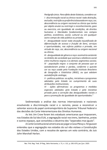 Rev. Trib. Reg. Trab. 3ª Reg., Belo Horizonte, v. 71, n. 111, p. 281-679, jan./jun. 2025595Parágrafo único. Para efeito deste Estatuto, considera-se:I - discriminação racial ou étnico-racial: toda distinção, exclusão, restrição ou preferência baseada em raça, cor, descendência ou origem nacional ou étnica que tenha por objeto anular ou restringir o reconhecimento, gozo ou exercício, em igualdade de condições, de direitos humanos e liberdades fundamentais nos campos político, econômico, social, cultural ou em qualquer outro campo da vida pública ou privada;II - desigualdade racial: toda situação injustificada de diferenciação de acesso e fruição de bens, serviços e oportunidades, nas esferas pública e privada, em virtude de raça, cor, descendência ou origem nacional ou étnica;III - desigualdade de gênero e raça: assimetria existente no âmbito da sociedade que acentua a distância social entre mulheres negras e os demais segmentos sociais;IV - população negra: o conjunto de pessoas que se autodeclaram pretas e pardas, conforme o quesito cor ou raça usado pela Fundação Instituto Brasileiro de Geografia e Estatística (IBGE), ou que adotam autodefinição análoga;V - políticas públicas: as ações, iniciativas e programas adotados pelo Estado no cumprimento de suas atribuições institucionais;VI - ações afirmativas: os programas e medidas especiais adotados pelo Estado e pela iniciativa privada para a correção das desigualdades raciais e para a promoção da igualdade de oportunidades.”Sedimentada a análise das normas internacionais e nacionais envolvendo a discriminação racial e o racismo, passo a reconstruir a salientar acerca do papel contramajoritário do Supremo Tribunal Federal e das decisões da Corte Interamericana dos Direitos Humanos.As leis Jim Crow foram leis estaduais americanas que impuseram, nos Estados do Sul dos EUA, a segregação racial nos trens, banheiros, praias e outros espaços, que consolidou a doutrina dos “separados mas iguais”.A Corte Constitucional americana ao julgar o Caso Plessy v. Fergusson entendeu que a segregação nos estados do sul não violava a Constituição dos Estados Unidos, com a ressalva de apenas um voto contrário, do Juiz John Marshall Harlan.