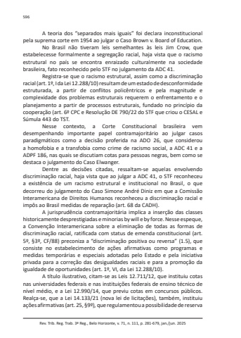 Rev. Trib. Reg. Trab. 3ª Reg., Belo Horizonte, v. 71, n. 111, p. 281-679, jan./jun. 2025596A teoria dos “separados mais iguais” foi declara inconstitucional pela suprema corte em 1954 ao julgar o Caso Brown v. Board of Education.No Brasil não tiveram leis semelhantes às leis Jim Crow, que estabelecesse formalmente a segregação racial, haja vista que o racismo estrutural no país se encontra enraizado culturalmente na sociedade brasileira, fato reconhecido pelo STF no julgamento da ADC 41.Registra-se que o racismo estrutural, assim como a discriminação racial (art. 1º, I da Lei 12.288/10) resultam de um estado de desconformidade estruturada, a partir de conflitos policêntricos e pela magnitude e complexidade dos problemas estruturais requerem o enfrentamento e o planejamento a partir de processos estruturais, fundado no princípio da cooperação (art. 6º CPC e Resolução DE 790/22 do STF que criou o CESAL e Súmula 443 do TST.Nesse contexto, a Corte Constitucional brasileira vem desempenhando importante papel contramajoritário ao julgar casos paradigmáticos como a decisão proferida na ADO 26, que considerou a homofobia e a transfobia como crime de racismo social, a ADC 41 e a ADPF 186, nas quais se discutiam cotas para pessoas negras, bem como se destaca o julgamento do Caso Elwanger.Dentre as decisões citadas, ressaltam-se aquelas envolvendo discriminação racial, haja vista que ao julgar a ADC 41, o STF reconheceu a existência de um racismo estrutural e institucional no Brasil, o que decorreu do julgamento do Caso Simone André Diniz em que a Comissão Interamericana de Direitos Humanos reconheceu a discriminação racial e impôs ao Brasil medidas de reparação (art. 68 da CADH).A jurisprudência contramajoritária implica a inserção das classes historicamente desprestigiadas e minorias by will e by force. Nesse espeque, a Convenção Interamericana sobre a eliminação de todas as formas de discriminação racial, ratificada com status de emenda constitucional (art. 5º, §3º, CF/88) preconiza a “discriminação positiva ou reversa” (1.5), que consiste no estabelecimento de ações afirmativas como programas e medidas temporárias e especiais adotadas pelo Estado e pela iniciativa privada para a correção das desigualdades raciais e para a promoção da igualdade de oportunidades (art. 1º, VI, da Lei 12.288/10).A título ilustrativo, citam-se as Leis 12.711/12, que instituiu cotas nas universidades federais e nas instituições federais de ensino técnico de nível médio, e a Lei 12.990/14, que previu cotas em concursos públicos. Realça-se, que a Lei 14.133/21 (nova lei de licitações), também, instituiu ações afirmativas (art. 25, §9º), que regulamentou a possibilidade de reserva