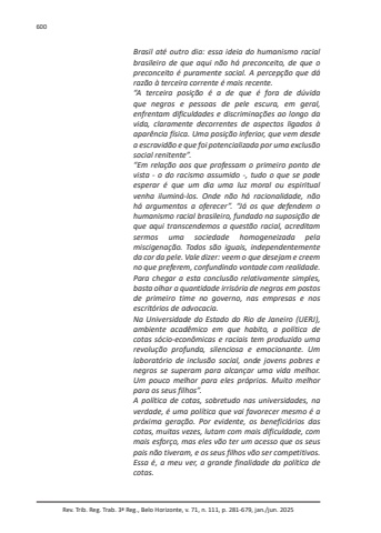 Rev. Trib. Reg. Trab. 3ª Reg., Belo Horizonte, v. 71, n. 111, p. 281-679, jan./jun. 2025600Brasil até outro dia: essa ideia do humanismo racial brasileiro de que aqui não há preconceito, de que o preconceito é puramente social. A percepção que dá razão à terceira corrente é mais recente.“A terceira posição é a de que é fora de dúvida que negros e pessoas de pele escura, em geral, enfrentam dificuldades e discriminações ao longo da vida, claramente decorrentes de aspectos ligados à aparência física. Uma posição inferior, que vem desde a escravidão e que foi potencializada por uma exclusão social renitente”.“Em relação aos que professam o primeiro ponto de vista - o do racismo assumido -, tudo o que se pode esperar é que um dia uma luz moral ou espiritual venha iluminá-los. Onde não há racionalidade, não há argumentos a oferecer”. “Já os que defendem o humanismo racial brasileiro, fundado na suposição de que aqui transcendemos a questão racial, acreditam sermos uma sociedade homogeneizada pela miscigenação. Todos são iguais, independentemente da cor da pele. Vale dizer: veem o que desejam e creem no que preferem, confundindo vontade com realidade. Para chegar a esta conclusão relativamente simples, basta olhar a quantidade irrisória de negros em postos de primeiro time no governo, nas empresas e nos escritórios de advocacia.Na Universidade do Estado do Rio de Janeiro (UERJ), ambiente acadêmico em que habito, a política de cotas sócio-econômicas e raciais tem produzido uma revolução profunda, silenciosa e emocionante. Um laboratório de inclusão social, onde jovens pobres e negros se superam para alcançar uma vida melhor. Um pouco melhor para eles próprios. Muito melhor para os seus filhos”.A política de cotas, sobretudo nas universidades, na verdade, é uma política que vai favorecer mesmo é a próxima geração. Por evidente, os beneficiários das cotas, muitas vezes, lutam com mais dificuldade, com mais esforço, mas eles vão ter um acesso que os seus pais não tiveram, e os seus filhos vão ser competitivos. Essa é, a meu ver, a grande finalidade da política de cotas.