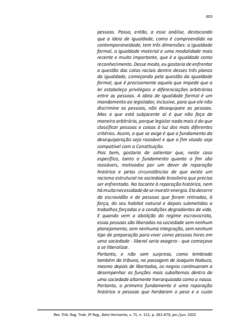 Rev. Trib. Reg. Trab. 3ª Reg., Belo Horizonte, v. 71, n. 111, p. 281-679, jan./jun. 2025603pessoas. Passo, então, a essa análise, destacando que a ideia de igualdade, como é compreendida na contemporaneidade, tem três dimensões: a igualdade formal, a igualdade material e uma modalidade mais recente e muito importante, que é a igualdade como reconhecimento. Desse modo, eu gostaria de enfrentar a questão das cotas raciais dentro desses três planos da igualdade, começando pela questão da igualdade formal, que é precisamente aquela que impede que a lei estabeleça privilégios e diferenciações arbitrárias entre as pessoas. A ideia de igualdade formal é um mandamento ao legislador, inclusive, para que ele não discrimine as pessoas, não desequipare as pessoas. Mas o que está subjacente aí é que não faça de maneira arbitrária, porque legislar nada mais é do que classificar pessoas e coisas à luz dos mais diferentes critérios. Assim, o que se exige é que o fundamento da desequiparação seja razoável e que o fim visado seja compatível com a Constituição.Pois bem, gostaria de salientar que, neste caso específico, tanto o fundamento quanto o fim são razoáveis, motivados por um dever de reparação histórica e pelas circunstâncias de que existe um racismo estrutural na sociedade brasileira que precisa ser enfrentado. No tocante à reparação histórica, nem há muita necessidade de se investir energia. Ela decorre da escravidão e de pessoas que foram retiradas, à força, do seu habitat natural e depois submetidas a trabalhos forçados e a condições degradantes de vida. E quando vem a abolição do regime escravocrata, essas pessoas são liberadas na sociedade sem nenhum planejamento, sem nenhuma integração, sem nenhum tipo de preparação para viver como pessoas livres em uma sociedade - liberal seria exagero - que começava a se liberalizar.Portanto, e não sem surpresa, como lembrado também da tribuna, na passagem de Joaquim Nabuco, mesmo depois de libertados, os negros continuaram a desempenhar as funções mais subalternas dentro de uma sociedade altamente hierarquizada como a nossa.Portanto, o primeiro fundamento é uma reparação histórica a pessoas que herdaram o peso e o custo
