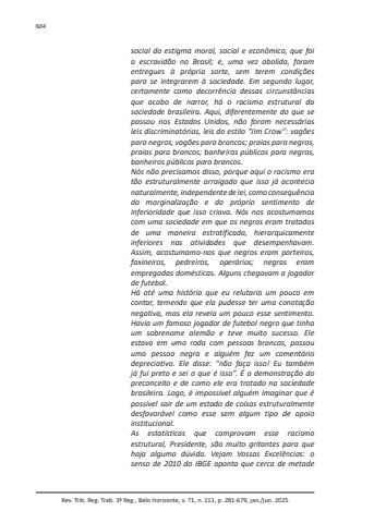 Rev. Trib. Reg. Trab. 3ª Reg., Belo Horizonte, v. 71, n. 111, p. 281-679, jan./jun. 2025604social do estigma moral, social e econômico, que foi a escravidão no Brasil; e, uma vez abolida, foram entregues à própria sorte, sem terem condições para se integrarem à sociedade. Em segundo lugar, certamente como decorrência dessas circunstâncias que acabo de narrar, há o racismo estrutural da sociedade brasileira. Aqui, diferentemente do que se passou nos Estados Unidos, não foram necessárias leis discriminatórias, leis do estilo “Jim Crow”: vagões para negros, vagões para brancos; praias para negros, praias para brancos; banheiros públicos para negros, banheiros públicos para brancos.Nós não precisamos disso, porque aqui o racismo era tão estruturalmente arraigado que isso já acontecia naturalmente, independente de lei, como consequência da marginalização e do próprio sentimento de inferioridade que isso criava. Nós nos acostumamos com uma sociedade em que os negros eram tratados de uma maneira estratificada, hierarquicamente inferiores nas atividades que desempenhavam. Assim, acostumamo-nos que negros eram porteiros, faxineiros, pedreiros, operários; negras eram empregadas domésticas. Alguns chegavam a jogador de futebol.Há até uma história que eu relutaria um pouco em contar, temendo que ela pudesse ter uma conotação negativa, mas ela revela um pouco esse sentimento. Havia um famoso jogador de futebol negro que tinha um sobrenome alemão e teve muito sucesso. Ele estava em uma roda com pessoas brancas, passou uma pessoa negra e alguém fez um comentário depreciativo. Ele disse: “não faça isso! Eu também já fui preto e sei o que é isso”. É a demonstração do preconceito e de como ele era tratado na sociedade brasileira. Logo, é impossível alguém imaginar que é possível sair de um estado de coisas estruturalmente desfavorável como esse sem algum tipo de apoio institucional.As estatísticas que comprovam esse racismo estrutural, Presidente, são muito gritantes para que haja alguma dúvida. Vejam Vossas Excelências: o senso de 2010 do IBGE aponta que cerca de metade