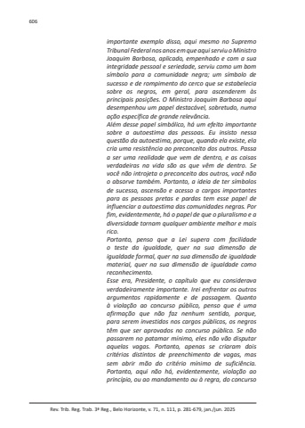 Rev. Trib. Reg. Trab. 3ª Reg., Belo Horizonte, v. 71, n. 111, p. 281-679, jan./jun. 2025606importante exemplo disso, aqui mesmo no Supremo Tribunal Federal nos anos em que aqui serviu o Ministro Joaquim Barbosa, aplicado, empenhado e com a sua integridade pessoal e seriedade, serviu como um bom símbolo para a comunidade negra; um símbolo de sucesso e de rompimento do cerco que se estabelecia sobre os negros, em geral, para ascenderem às principais posições. O Ministro Joaquim Barbosa aqui desempenhou um papel destacável, sobretudo, numa ação específica de grande relevância.Além desse papel simbólico, há um efeito importante sobre a autoestima das pessoas. Eu insisto nessa questão da autoestima, porque, quando ela existe, ela cria uma resistência ao preconceito dos outros. Passa a ser uma realidade que vem de dentro, e as coisas verdadeiras na vida são as que vêm de dentro. Se você não introjeta o preconceito dos outros, você não o absorve também. Portanto, a ideia de ter símbolos de sucesso, ascensão e acesso a cargos importantes para as pessoas pretas e pardas tem esse papel de influenciar a autoestima das comunidades negras. Por fim, evidentemente, há o papel de que o pluralismo e a diversidade tornam qualquer ambiente melhor e mais rico.Portanto, penso que a Lei supera com facilidade o teste da igualdade, quer na sua dimensão de igualdade formal, quer na sua dimensão de igualdade material, quer na sua dimensão de igualdade como reconhecimento.Esse era, Presidente, o capítulo que eu considerava verdadeiramente importante. Irei enfrentar os outros argumentos rapidamente e de passagem. Quanto à violação ao concurso público, penso que é uma afirmação que não faz nenhum sentido, porque, para serem investidos nos cargos públicos, os negros têm que ser aprovados no concurso público. Se não passarem no patamar mínimo, eles não vão disputar aquelas vagas. Portanto, apenas se criaram dois critérios distintos de preenchimento de vagas, mas sem abrir mão do critério mínimo de suficiência. Portanto, aqui não há, evidentemente, violação ao princípio, ou ao mandamento ou à regra, do concurso