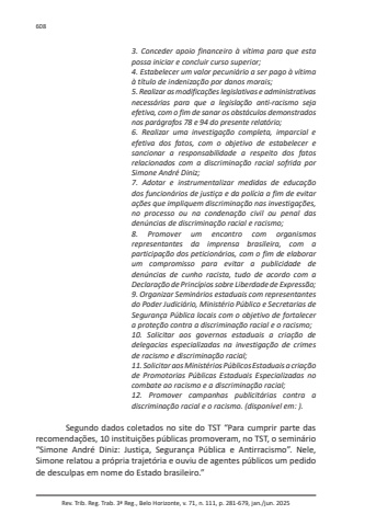 Rev. Trib. Reg. Trab. 3ª Reg., Belo Horizonte, v. 71, n. 111, p. 281-679, jan./jun. 20256083. Conceder apoio financeiro à vítima para que esta possa iniciar e concluir curso superior;4. Estabelecer um valor pecuniário a ser pago à vítima à título de indenização por danos morais;5. Realizar as modificações legislativas e administrativas necessárias para que a legislação anti-racismo seja efetiva, com o fim de sanar os obstáculos demonstrados nos parágrafos 78 e 94 do presente relatório;6. Realizar uma investigação completa, imparcial e efetiva dos fatos, com o objetivo de estabelecer e sancionar a responsabilidade a respeito dos fatos relacionados com a discriminação racial sofrida por Simone André Diniz;7. Adotar e instrumentalizar medidas de educação dos funcionários de justiça e da polícia a fim de evitar ações que impliquem discriminação nas investigações, no processo ou na condenação civil ou penal das denúncias de discriminação racial e racismo;8. Promover um encontro com organismos representantes da imprensa brasileira, com a participação dos peticionários, com o fim de elaborar um compromisso para evitar a publicidade de denúncias de cunho racista, tudo de acordo com a Declaração de Princípios sobre Liberdade de Expressão;9. Organizar Seminários estaduais com representantes do Poder Judiciário, Ministério Público e Secretarias de Segurança Pública locais com o objetivo de fortalecer a proteção contra a discriminação racial e o racismo;10. Solicitar aos governos estaduais a criação de delegacias especializadas na investigação de crimes de racismo e discriminação racial;11. Solicitar aos Ministérios Públicos Estaduais a criação de Promotorias Públicas Estaduais Especializadas no combate ao racismo e a discriminação racial;12. Promover campanhas publicitárias contra a discriminação racial e o racismo. (disponível em: ).Segundo dados coletados no site do TST “Para cumprir parte das recomendações, 10 instituições públicas promoveram, no TST, o seminário “Simone André Diniz: Justiça, Segurança Pública e Antirracismo”. Nele, Simone relatou a própria trajetória e ouviu de agentes públicos um pedido de desculpas em nome do Estado brasileiro.”