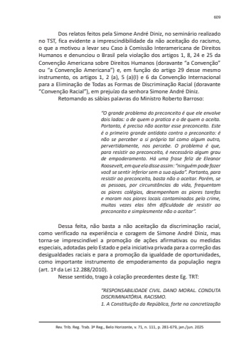 Rev. Trib. Reg. Trab. 3ª Reg., Belo Horizonte, v. 71, n. 111, p. 281-679, jan./jun. 2025609Dos relatos feitos pela Simone André Diniz, no seminário realizado no TST, fica evidente a imprescindibilidade da não aceitação do racismo, o que a motivou a levar seu Caso à Comissão Interamericana de Direitos Humanos e denunciou o Brasil pela violação dos artigos 1, 8, 24 e 25 da Convenção Americana sobre Direitos Humanos (doravante “a Convenção” ou “a Convenção Americana”) e, em função do artigo 29 desse mesmo instrumento, os artigos 1, 2 (a), 5 (a)(I) e 6 da Convenção Internacional para a Eliminação de Todas as Formas de Discriminação Racial (doravante “Convenção Racial”), em prejuízo da senhora Simone André Diniz.Retomando as sábias palavras do Ministro Roberto Barroso:“O grande problema do preconceito é que ele envolve dois lados: o de quem o pratica e o de quem o aceita. Portanto, é preciso não aceitar esse preconceito. Este é o primeiro grande antídoto contra o preconceito: é não se perceber a si próprio tal como algum outro, pervertidamente, nos percebe. O problema é que, para resistir ao preconceito, é necessário algum grau de empoderamento. Há uma frase feliz de Eleanor Roosevelt, em que ela disse assim: “ninguém pode fazer você se sentir inferior sem a sua ajuda”. Portanto, para resistir ao preconceito, basta não o aceitar. Porém, se as pessoas, por circunstâncias da vida, frequentam os piores colégios, desempenham as piores tarefas e moram nos piores locais contaminados pelo crime, muitas vezes elas têm dificuldade de resistir ao preconceito e simplesmente não o aceitar”.Dessa feita, não basta a não aceitação da discriminação racial, como verificado na experiência e coragem de Simone André Diniz, mas torna-se imprescindível a promoção de ações afirmativas ou medidas especiais, adotadas pelo Estado e pela iniciativa privada para a correção das desigualdades raciais e para a promoção da igualdade de oportunidades, como importante instrumento de empoderamento da população negra (art. 1º da Lei 12.288/2010).Nesse sentido, trago à colação precedentes deste Eg. TRT:“RESPONSABILIDADE CIVIL. DANO MORAL. CONDUTA DISCRIMINATÓRIA. RACISMO.1. A Constituição da República, forte na concretização