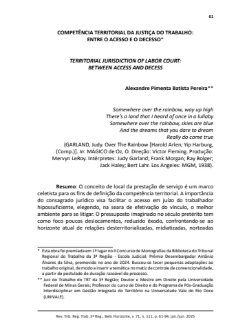 61Rev. Trib. Reg. Trab. 3ª Reg., Belo Horizonte, v. 71, n. 111, p. 61-94, jan./jun. 2025COMPETÊNCIA TERRITORIAL DA JUSTIÇA DO TRABALHO:ENTRE O ACESSO E O DECESSO*TERRITORIAL JURISDICTION OF LABOR COURT:BETWEEN ACCESS AND DECESSAlexandre Pimenta Batista Pereira**Somewhere over the rainbow, way up highThere’s a land that I heard of once in a lullabySomewhere over the rainbow, skies are blueAnd the dreams that you dare to dreamReally do come true(GARLAND, Judy. Over The Rainbow [Harold Arlen; Yip Harburg, (Comp.)]. In: MÁGICO de Oz, O. Direção: Victor Fleming. Produção: Mervyn LeRoy. Intérpretes: Judy Garland; Frank Morgan; Ray Bolger; Jack Haley; Bert Lahr. Los Angeles: MGM, 1938).Resumo: O conceito de local da prestação de serviço é um marco celetista para os fins de definição da competência territorial. A importância do consagrado jurídico visa facilitar o acesso em juízo do trabalhador hipossuficiente, elegendo, na seara de efetivação do vínculo, o melhor ambiente para se litigar. O pressuposto imaginado no século pretérito tem como foco poucos deslocamentos, reduzido êxodo, confrontando-se ao horizonte atual de relações desterritorializadas, midiatizadas, norteadas * Esta obra foi premiada em 1º lugar no II Concurso de Monografias da Biblioteca do Tribunal Regional do Trabalho da 3ª Região - Escola Judicial; Prêmio Desembargador Antônio Álvares da Silva, promovido no ano de 2024. Buscou-se tecer pequenas adaptações ao trabalho original, de modo a inserir a temática no matiz de controle de convencionalidade, a partir do postulado de duração razoável do processo.** Juiz do Trabalho do TRT da 3ª Região; Doutor e Mestre em Direito pela Universidade Federal de Minas Gerais; Professor do curso de Direito e do Programa de Pós-Graduação Interdisciplinar em Gestão Integrada do Território na Universidade Vale do Rio Doce (UNIVALE).