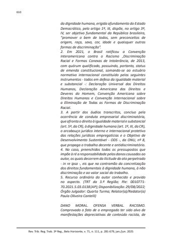 Rev. Trib. Reg. Trab. 3ª Reg., Belo Horizonte, v. 71, n. 111, p. 281-679, jan./jun. 2025610da dignidade humana, erigida afundamento do Estado Democrático, pelo artigo 1º, III, dispõe, no artigo 3º, IV, ser objetivo fundamental da República brasileira, “promover o bem de todos, sem preconceitos de origem, raça, sexo, cor, idade e quaisquer outras formas de discriminação”.2. Em 2021, o Brasil ratificou a Convenção Interamericana contra o Racismo ,Discriminação Racial e Formas Conexas de Intolerância, de 2013, com quórum qualificado, possuindo, portanto, status de emenda constitucional, somando-se ao estuário normativo internacional constituído pelos seguintes instrumentos - todos em defesa da igualdade material e substancial -: Declaração Universal dos Direitos Humanos, Declaração Americana dos Direitos e Deveres do Homem, Convenção Americana sobre Direitos Humanos e Convenção Internacional sobre a Eliminação de Todas as Formas de Discriminação Racial.3. A partir dos áudios transcritos, concluo pela ocorrência de conduta empresarial discriminatória, que afronta o direito à igualdade material e substancial (art. 5º, da CR), à dignidade humana (art. 1º, III, da CR), o arcabouço jurídico interno e internacional protetivo das relações jurídicas empregatícias e o Objetivo de Desenvolvimento Sustentável - ODS -, da ONU, nº 8, que propaga o trabalho decente e antidiscriminatório.4. No caso, preenchidos todos os pressupostos que impõe à ré a responsabilidade pelos danos causados ao autor, os quais decorrem da ilicitude do ato perpetrado - in re ipsa -, eis que na contramão da concretização dos direitos fundamentais à dignidade humana, à não discriminação e ao valor social do trabalho.5. Recurso ordinário do autor conhecido e provido no aspecto. (TRT da 3.ª Região; PJe: 0010771-70.2021.5.03.0138 (AP); Disponibilização: 29/08/2022; Órgão Julgador: Quarta Turma; Relator(a)/Redator(a) Paula Oliveira Cantelli)DANO MORAL. OFENSA VERBAL. RACISMO. Comprovado o fato de o empregado ter sido alvo de manifestações depreciativas de conteúdo racista, de