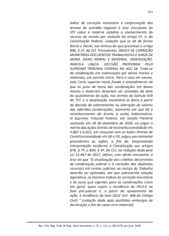 Rev. Trib. Reg. Trab. 3ª Reg., Belo Horizonte, v. 71, n. 111, p. 281-679, jan./jun. 2025613índice de correção monetária e conformação dos termos do acórdão regional à tese vinculante do STF sobre a matéria viabiliza o conhecimento do recurso de revista por violação do artigo 5º, II, da Constituição Federal, violação que se dá de forma direta e literal, nos termos do que preceitua o artigo 896, § 2º, da CLT. Precedentes. ÍNDICE DE CORREÇÃO MONETÁRIA DOS DÉBITOS TRABALHISTAS E JUROS DE MORA. DANO MORAL E MATERIAL. INDENIZAÇÃO. PARCELA ÚNICA. DECISÃO PROFERIDA PELO SUPREMO TRIBUNAL FEDERAL NA ADC 58. Trata-se de condenação em indenização por danos morais e materiais, em parcela única. Para o caso em exame, esta Corte superior havia fixado o entendimento de que os juros de mora das condenações em danos morais e materiais deveriam ser contados da data do ajuizamento da ação, nos termos da Súmula 439 do TST, e a atualização monetária se daria a partir da decisão de arbitramento ou alteração de valores das referidas condenações, momento em que há o reconhecimento do direito à verba indenizatória. O Supremo Tribunal Federal, em Sessão Plenária realizada em 18 de dezembro de 2020, ao julgar o mérito das Ações Diretas de Inconstitucionalidade nºs 5.867 e 6.021, em conjunto com as Ações Diretas de Constitucionalidade nºs 58 e 59, julgou parcialmente procedentes as ações, a fim de, emprestando interpretação conforme à Constituição aos artigos 879, § 7º, e 899, § 4º, da CLT, na redação dada pela Lei 13.467 de 2017, definir, com efeito vinculante, a tese de que “à atualização dos créditos decorrentes de condenação judicial e à correção dos depósitos recursais em contas judiciais na Justiça do Trabalho deverão ser aplicados, até que sobrevenha solução legislativa, os mesmos índices de correção monetária e de juros que vigentes para as condenações cíveis em geral, quais sejam a incidência do IPCA-E na fase pré-judicial e, a partir do ajuizamento da ação, a incidência da taxa SELIC (art. 406 do Código Civil) “ (redação dada após acolhidos embargos de declaração a fim de sanar erro material).