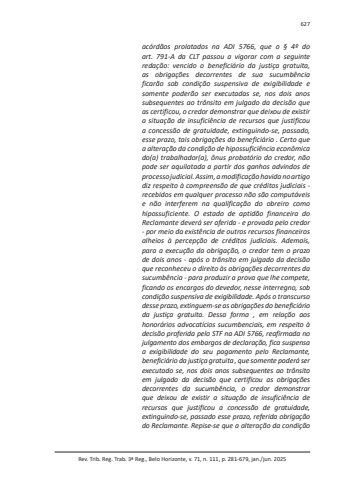 Rev. Trib. Reg. Trab. 3ª Reg., Belo Horizonte, v. 71, n. 111, p. 281-679, jan./jun. 2025627acórdãos prolatados na ADI 5766, que o § 4º do art. 791-A da CLT passou a vigorar com a seguinte redação: vencido o beneficiário da justiça gratuita, as obrigações decorrentes de sua sucumbência ficarão sob condição suspensiva de exigibilidade e somente poderão ser executadas se, nos dois anos subsequentes ao trânsito em julgado da decisão que as certificou, o credor demonstrar que deixou de existir a situação de insuficiência de recursos que justificou a concessão de gratuidade, extinguindo-se, passado, esse prazo, tais obrigações do beneficiário . Certo que a alteração da condição de hipossuficiência econômica do(a) trabalhador(a), ônus probatório do credor, não pode ser aquilatada a partir dos ganhos advindos de processo judicial. Assim, a modificação havida no artigo diz respeito à compreensão de que créditos judiciais - recebidos em qualquer processo não são computáveis e não interferem na qualificação do obreiro como hipossuficiente. O estado de aptidão financeira do Reclamante deverá ser aferida - e provada pelo credor - por meio da existência de outros recursos financeiros alheios à percepção de créditos judiciais. Ademais, para a execução da obrigação, o credor tem o prazo de dois anos - após o trânsito em julgado da decisão que reconheceu o direito às obrigações decorrentes da sucumbência - para produzir a prova que lhe compete, ficando os encargos do devedor, nesse interregno, sob condição suspensiva de exigibilidade. Após o transcurso desse prazo, extinguem-se as obrigações do beneficiário da justiça gratuita. Dessa forma , em relação aos honorários advocatícios sucumbenciais, em respeito à decisão proferida pelo STF na ADI 5766, reafirmada no julgamento dos embargos de declaração, fica suspensa a exigibilidade do seu pagamento pelo Reclamante, beneficiário da justiça gratuita , que somente poderá ser executado se, nos dois anos subsequentes ao trânsito em julgado da decisão que certificou as obrigações decorrentes da sucumbência, o credor demonstrar que deixou de existir a situação de insuficiência de recursos que justificou a concessão de gratuidade, extinguindo-se, passado esse prazo, referida obrigação do Reclamante. Repise-se que a alteração da condição