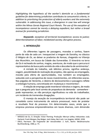 63Rev. Trib. Reg. Trab. 3ª Reg., Belo Horizonte, v. 71, n. 111, p. 61-94, jan./jun. 2025Highlighting the hypothesis of the worker’s domicile as a fundamental guideline for determining jurisdiction contributes to consumerist criteria, in addition to prioritizing the protection of elderly workers and the extremely vulnerable. In addressing this issue, a divergence in case law will emerge within the Minas Gerais Regional Court Panels. The use of the exception of incompetence cannot be merely a delaying expedient, but rather a broad avenue for promoting jurisdiction. Keywords: exception of territorial incompetence; access to justice; deterritorialization of labor; mediatized society; disruptive process.1. INTRODUÇÃOOs diferentes lugares de passagens, moradas e sonhos, fazem parte da vida de cada um. Inesquecível a imagem de Dorothy, no clássico O Mágico de Oz, ao deixar as pradarias do Kansas, chegando no Vilarejo dos Munchkin, em busca da Cidade das Esmeraldas. O itinerário na terra de Oz é recheado de sonhos, magias, aventuras, de modo que o percurso é representativo da busca pelo sentido da vida e descoberta de sentimentos1.A miríade do trabalho, sob idêntico prisma, significa andança, viagem, possibilidade de realização de projetos, não apenas ao empregado, movido pela oferta de oportunidades, mas também ao empregador, seduzido com a perspectiva de novos investimentos, em diferentes searas. Nas pegadas de Heráclito, o ideário de deslocamentos e passagens reflete a ontologia humana, concretizada em mudanças e movimentos2.A relação de emprego pode reverberar trânsitos e viagens, de modo que a pergunta pelo local correto de propositura da demanda - somewhere - pode representar, se não percalços significativos na vida do trabalhador, um incidente de tremendas divagações.O manejo da exceção de incompetência territorial não pode ser concebido como instrumento de astúcia processual, meio de protelar o resultado final do processo. Em determinados casos, ainda que a empresa promova empreendimentos em locais diversos, com dimensão 1 MÁGICO de Oz, O. Direção: Victor Fleming. Produção: Mervyn LeRoy. Intérpretes: Judy Garland; Frank Morgan; Ray Bolger; Jack Haley; Bert Lahr. Los Angeles: MGM, 1938. 2 DIELS, Hermann. Die Fragmente der Vorsokratiker. 2. Aufl., Berlin: Weidmannsche Buchhandlung, 1906, p. 75.