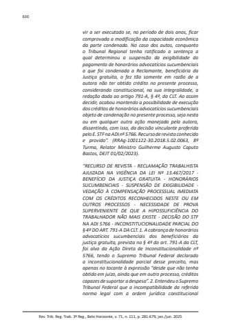 Rev. Trib. Reg. Trab. 3ª Reg., Belo Horizonte, v. 71, n. 111, p. 281-679, jan./jun. 2025630vir a ser executado se, no período de dois anos, ficar comprovada a modificação da capacidade econômica da parte condenada. No caso dos autos, conquanto o Tribunal Regional tenha ratificado a sentença a qual determinou a suspensão da exigibilidade do pagamento de honorários advocatícios sucumbenciais a que foi condenada a Reclamante, beneficiária da Justiça gratuita, o fez tão somente em razão de a autora não ter obtido crédito no presente processo, considerando constitucional, na sua integralidade, a redação dada ao artigo 791-A, § 4º, da CLT. Ao assim decidir, acabou mantendo a possibilidade de execução dos créditos de honorários advocatícios sucumbenciais objeto de condenação no presente processo, seja nesta ou em qualquer outra ação manejada pela autora, dissentindo, com isso, da decisão vinculante proferida pelo E. STF na ADI nº 5766. Recurso de revista conhecido e provido”. (RRAg-1001122-30.2018.5.02.0063, 8ª Turma, Relator Ministro Guilherme Augusto Caputo Bastos, DEJT 01/02/2023).“RECURSO DE REVISTA - RECLAMAÇÃO TRABALHISTA AJUIZADA NA VIGÊNCIA DA LEI Nº 13.467/2017 - BENEFÍCIO DA JUSTIÇA GRATUITA - HONORÁRIOS SUCUMBENCIAIS - SUSPENSÃO DE EXIGIBILIDADE - VEDAÇÃO À COMPENSAÇÃO PROCESSUAL IMEDIATA COM OS CRÉDITOS RECONHECIDOS NESTE OU EM OUTROS PROCESSOS - NECESSIDADE DE PROVA SUPERVENIENTE DE QUE A HIPOSSUFICIÊNCIA DO TRABALHADOR NÃO MAIS EXISTE - DECISÃO DO STF NA ADI 5766 - INCONSTITUCIONALIDADE PARCIAL DO § 4º DO ART. 791-A DA CLT. 1. A cobrança de honorários advocatícios sucumbenciais dos beneficiários da justiça gratuita, prevista no § 4º do art. 791-A da CLT, foi alvo da Ação Direta de Inconstitucionalidade nº 5766, tendo o Supremo Tribunal Federal declarado a inconstitucionalidade parcial desse preceito, mas apenas no tocante à expressão “desde que não tenha obtido em juízo, ainda que em outro processo, créditos capazes de suportar a despesa”. 2. Entendeu o Supremo Tribunal Federal que a incompatibilidade da referida norma legal com a ordem jurídica constitucional