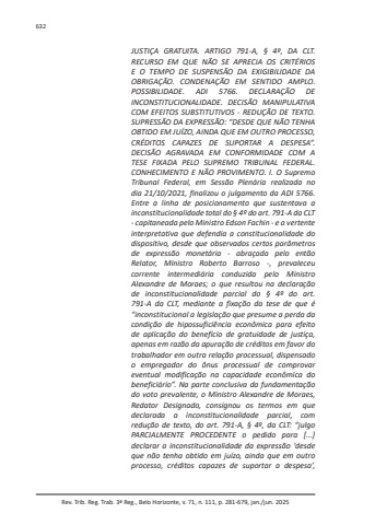 Rev. Trib. Reg. Trab. 3ª Reg., Belo Horizonte, v. 71, n. 111, p. 281-679, jan./jun. 2025632JUSTIÇA GRATUITA. ARTIGO 791-A, § 4º, DA CLT. RECURSO EM QUE NÃO SE APRECIA OS CRITÉRIOS E O TEMPO DE SUSPENSÃO DA EXIGIBILIDADE DA OBRIGAÇÃO. CONDENAÇÃO EM SENTIDO AMPLO. POSSIBILIDADE. ADI 5766. DECLARAÇÃO DE INCONSTITUCIONALIDADE. DECISÃO MANIPULATIVA COM EFEITOS SUBSTITUTIVOS - REDUÇÃO DE TEXTO. SUPRESSÃO DA EXPRESSÃO: “DESDE QUE NÃO TENHA OBTIDO EM JUÍZO, AINDA QUE EM OUTRO PROCESSO, CRÉDITOS CAPAZES DE SUPORTAR A DESPESA”. DECISÃO AGRAVADA EM CONFORMIDADE COM A TESE FIXADA PELO SUPREMO TRIBUNAL FEDERAL. CONHECIMENTO E NÃO PROVIMENTO. I. O Supremo Tribunal Federal, em Sessão Plenária realizada no dia 21/10/2021, finalizou o julgamento da ADI 5766. Entre a linha de posicionamento que sustentava a inconstitucionalidade total do § 4º do art. 791-A da CLT - capitaneada pelo Ministro Edson Fachin - e a vertente interpretativa que defendia a constitucionalidade do dispositivo, desde que observados certos parâmetros de expressão monetária - abraçada pelo então Relator, Ministro Roberto Barroso -, prevaleceu corrente intermediária conduzida pelo Ministro Alexandre de Moraes; o que resultou na declaração de inconstitucionalidade parcial do § 4º do art. 791-A da CLT, mediante a fixação da tese de que é “inconstitucional a legislação que presume a perda da condição de hipossuficiência econômica para efeito de aplicação do benefício de gratuidade de justiça, apenas em razão da apuração de créditos em favor do trabalhador em outra relação processual, dispensado o empregador do ônus processual de comprovar eventual modificação na capacidade econômica do beneficiário”. Na parte conclusiva da fundamentação do voto prevalente, o Ministro Alexandre de Moraes, Redator Designado, consignou os termos em que declarada a inconstitucionalidade parcial, com redução de texto, do art. 791-A, § 4º, da CLT: “julgo PARCIALMENTE PROCEDENTE o pedido para [...] declarar a inconstitucionalidade da expressão ‘desde que não tenha obtido em juízo, ainda que em outro processo, créditos capazes de suportar a despesa’,