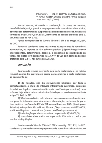 Rev. Trib. Reg. Trab. 3ª Reg., Belo Horizonte, v. 71, n. 111, p. 281-679, jan./jun. 2025634provimento”. (Ag-RR-1000715-07.2018.5.02.0004, 7ª Turma, Relator Ministro Evandro Pereira Valadao Lopes, DEJT 19/12/2022).Nestes termos, é devida a condenação da parte reclamante, beneficiária da justiça gratuita, ao pagamento de honorários advocatícios, devendo ser determinada a suspensão da exigibilidade da verba, nos exatos termos do artigo 791-A, §4º, da CLT, bem como da decisão proferida pelo E. STF, nos autos da ADI 5766.Aplico as disposições da Súmula 256 do E. STF e do artigo 322, §1º, do CPC.Portanto, condeno a parte reclamante ao pagamento de honorários advocatícios, no importe de 15% sobre os pedidos julgados integralmente improcedentes, determinado, desde já, a suspensão da exigibilidade da verba, nos exatos termos do artigo 791-A, §4º, da CLT, bem como da decisão proferida pelo E. STF, nos autos da ADI 5766.CONCLUSÃOConheço do recurso interposto pela parte reclamante e, no mérito recursal, confiro-lhe provimento parcial para condenar a parte reclamada ao pagamento de:1) 30 minutos, por dia efetivamente laborado, por toda a contratualidade, a título de intervalo intrajornada suprimido, acrescido do adicional legal ou convencional (o mais benéfico à parte autora), sem reflexos, haja vista a natureza indenizatória da parte, nos termos do citado artigo 71, §4º, da CLT;2) 30 minutos diários pelo labor no momento em que deveria estar em gozo do intervalo para descanso e alimentação, na forma da parte final do item I da Súmula 437 do TST, com reflexos em DSRs (domingos e feriados), aviso prévio, 13º salários, Férias +1/3 e, com estes, em FGTS+40%, e adicional legal ou convencional (o mais benéfico à parte autora);3) indenização por danos morais no importe de R$30.0 00,00;4) honorários advocatícios no importe de 15% sobre o valor que resultar de liquidação.Nos termos da Súmula 256 do E. STF e do artigo 322, §1º, do CPC, condeno a parte reclamante ao pagamento de honorários advocatícios, no