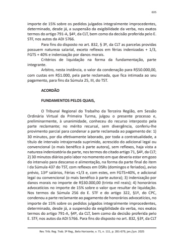 Rev. Trib. Reg. Trab. 3ª Reg., Belo Horizonte, v. 71, n. 111, p. 281-679, jan./jun. 2025635importe de 15% sobre os pedidos julgados integralmente improcedentes, determinado, desde já, a suspensão da exigibilidade da verba, nos exatos termos do artigo 791-A, §4º, da CLT, bem como da decisão proferida pelo E. STF, nos autos da ADI 5766.Para fins do disposto no art. 832, § 3º, da CLT as parcelas providas possuem natureza salarial, exceto reflexos em férias indenizadas + 1/3, FGTS + 40% e indenização por danos morais.Critérios de liquidação na forma da fundamentação, parte integrante.Arbitro, nesta instância, o valor da condenação para R$50.000,00, com custas em R$1.000, pela parte reclamada, que fica intimada ao seu pagamento, para fins da Súmula 25, III, do TST.ACORDÃOFUNDAMENTOS PELOS QUAIS,O Tribunal Regional do Trabalho da Terceira Região, em Sessão Ordinária Virtual da Primeira Turma, julgou o presente processo e, preliminarmente, à unanimidade, conheceu do recurso interposto pela parte reclamante; no mérito recursal, sem divergência, conferiu-lhe provimento parcial para condenar a parte reclamada ao pagamento de: 1) 30 minutos, por dia efetivamente laborado, por toda a contratualidade, a título de intervalo intrajornada suprimido, acrescido do adicional legal ou convencional (o mais benéfico à parte autora), sem reflexos, haja vista a natureza indenizatória da parte, nos termos do citado artigo 71, §4º, da CLT; 2) 30 minutos diários pelo labor no momento em que deveria estar em gozo do intervalo para descanso e alimentação, na forma da parte final do item I da Súmula 437 do TST, com reflexos em DSRs (domingos e feriados), aviso prévio, 13ºs salários, Férias +1/3 e, com estes, em FGTS+40%, e adicional legal ou convencional (o mais benéfico à parte autora); 3) indenização por danos morais no importe de R$30.000,00 (trinta mil reais); 4) honorários advocatícios no importe de 15% sobre o valor que resultar de liquidação. Nos termos da Súmula 256 do E. STF e do artigo 322, §1º, do CPC, condenou a parte reclamante ao pagamento de honorários advocatícios, no importe de 15% sobre os pedidos julgados integralmente improcedentes, determinado, desde já, a suspensão da exigibilidade da verba, nos exatos termos do artigo 791-A, §4º, da CLT, bem como da decisão proferida pelo E. STF, nos autos da ADI 5766. Para fins do disposto no art. 832, §3º, da CLT