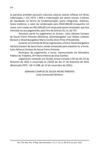 Rev. Trib. Reg. Trab. 3ª Reg., Belo Horizonte, v. 71, n. 111, p. 281-679, jan./jun. 2025636as parcelas providas possuem natureza salarial, exceto reflexos em férias indenizadas + 1/3, FGTS + 40% e indenização por danos morais. Critérios de liquidação na forma da fundamentação, parte integrante. Arbitrou, nesta instância, o valor da condenação para R$50.000,00 (cinquenta mil reais), com custas em R$1.000,00 (mil reais) pela parte reclamada, que fica intimada ao seu pagamento, para fins da Súmula 25, III, do TST.Tomaram parte no julgamento os Exmos.: Juíza Adriana Campos de Souza Freire Pimenta (Relatora), Desembargador Luiz Otávio Linhares Renault e Desembargadora Maria Cecília Alves Pinto (Presidente).Ausente, em virtude de férias regimentais, a Exma. Desembargadora Adriana Goulart de Sena Orsini, sendo convocada para substituí-la, a Exma. Juíza Adriana Campos de Souza Freire Pimenta.Participou do julgamento, a Exma. representante do Ministério Público do Trabalho, Drª Maria Helena da Silva Guthier.Julgamento realizado em Sessão virtual iniciada à 0h do dia 25 de fevereiro de 2025 e encerrada às 23h59 do dia 27 de fevereiro de 2025 (Resolução TRT3 - GP nº 208, de 12 de novembro de 2021).ADRIANA CAMPOS DE SOUZA FREIRE PIMENTAJuíza Convocada Relatora