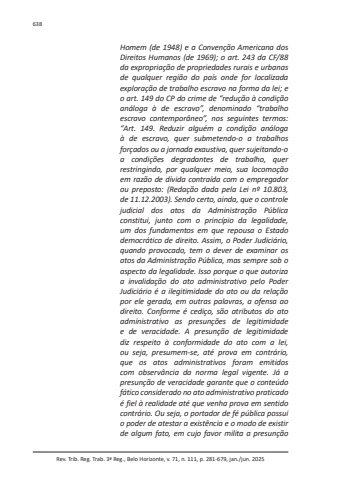 Rev. Trib. Reg. Trab. 3ª Reg., Belo Horizonte, v. 71, n. 111, p. 281-679, jan./jun. 2025638Homem (de 1948) e a Convenção Americana dos Direitos Humanos (de 1969); o art. 243 da CF/88 da expropriação de propriedades rurais e urbanas de qualquer região do país onde for localizada exploração de trabalho escravo na forma da lei; e o art. 149 do CP do crime de “redução à condição análoga à de escravo”, denominado “trabalho escravo contemporâneo”, nos seguintes termos: “Art. 149. Reduzir alguém a condição análoga à de escravo, quer submetendo-o a trabalhos forçados ou a jornada exaustiva, quer sujeitando-o a condições degradantes de trabalho, quer restringindo, por qualquer meio, sua locomoção em razão de dívida contraída com o empregador ou preposto: (Redação dada pela Lei nº 10.803, de 11.12.2003). Sendo certo, ainda, que o controle judicial dos atos da Administração Pública constitui, junto com o princípio da legalidade, um dos fundamentos em que repousa o Estado democrático de direito. Assim, o Poder Judiciário, quando provocado, tem o dever de examinar os atos da Administração Pública, mas sempre sob o aspecto da legalidade. Isso porque o que autoriza a invalidação do ato administrativo pelo Poder Judiciário é a ilegitimidade do ato ou da relação por ele gerada, em outras palavras, a ofensa ao direito. Conforme é cediço, são atributos do ato administrativo as presunções de legitimidade e de veracidade. A presunção de legitimidade diz respeito à conformidade do ato com a lei, ou seja, presumem-se, até prova em contrário, que os atos administrativos foram emitidos com observância da norma legal vigente. Já a presunção de veracidade garante que o conteúdo fático considerado no ato administrativo praticado é fiel à realidade até que venha prova em sentido contrário. Ou seja, o portador de fé pública possui o poder de atestar a existência e o modo de existir de algum fato, em cujo favor milita a presunção