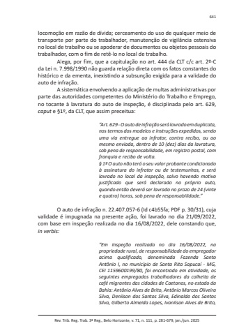 Rev. Trib. Reg. Trab. 3ª Reg., Belo Horizonte, v. 71, n. 111, p. 281-679, jan./jun. 2025641locomoção em razão de dívida; cerceamento do uso de qualquer meio de transporte por parte do trabalhador, manutenção de vigilância ostensiva no local de trabalho ou se apoderar de documentos ou objetos pessoais do trabalhador, com o fim de retê-lo no local de trabalho.Alega, por fim, que a capitulação no art. 444 da CLT c/c art. 2º-C da Lei n. 7.998/1990 não guarda relação direta com os fatos constantes do histórico e da ementa, inexistindo a subsunção exigida para a validade do auto de infração.A sistemática envolvendo a aplicação de multas administrativas por parte das autoridades competentes do Ministério do Trabalho e Emprego, no tocante à lavratura do auto de inspeção, é disciplinada pelo art. 629, caput e §1º, da CLT, que assim preceitua:“Art. 629 - O auto de infração será lavrado em duplicata, nos termos dos modelos e instruções expedidos, sendo uma via entregue ao infrator, contra recibo, ou ao mesmo enviada, dentro de 10 (dez) dias da lavratura, sob pena de responsabilidade, em registro postal, com franquia e recibo de volta.§ 1º O auto não terá o seu valor probante condicionado à assinatura do infrator ou de testemunhas, e será lavrado no local da inspeção, salvo havendo motivo justificado que será declarado no próprio auto, quando então deverá ser lavrado no prazo de 24 (vinte e quatro) horas, sob pena de responsabilidade.”O auto de infração n. 22.407.057-6 (Id c4b55fa; PDF p. 30/31), cuja validade é impugnada na presente ação, foi lavrado no dia 21/09/2022, com base em inspeção realizada no dia 16/08/2022, dele constando que, in verbis:“Em inspeção realizada no dia 16/08/2022, na propriedade rural, de responsabilidade do empregador acima qualificado, denominada Fazenda Santo Antônio I, no município de Santa Rita Sapucaí - MG, CEI 1159600199/80, foi encontrado em atividade, os seguintes empregados trabalhadores da colheita de café migrantes das cidades de Caetanos, no estado da Bahia: Antônio Alves de Brito, Antônio Marcos Oliveira Silva, Denilson dos Santos Silva, Edinaldo dos Santos Silva, Gilberto Almeida Lopes, Ivanilson Alves de Brito,