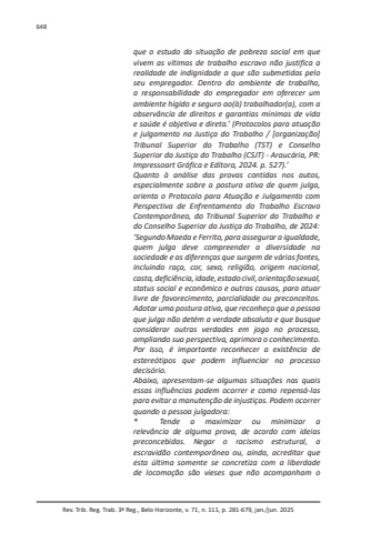 Rev. Trib. Reg. Trab. 3ª Reg., Belo Horizonte, v. 71, n. 111, p. 281-679, jan./jun. 2025648que o estudo da situação de pobreza social em que vivem as vítimas de trabalho escravo não justifica a realidade de indignidade a que são submetidas pelo seu empregador. Dentro do ambiente de trabalho, a responsabilidade do empregador em oferecer um ambiente hígido e seguro ao(à) trabalhador(a), com a observância de direitos e garantias mínimas de vida e saúde é objetiva e direta.’ (Protocolos para atuação e julgamento na Justiça do Trabalho / [organização] Tribunal Superior do Trabalho (TST) e Conselho Superior da Justiça do Trabalho (CSJT) - Araucária, PR: Impressoart Gráfica e Editora, 2024. p. 527).’Quanto à análise das provas contidas nos autos, especialmente sobre a postura ativa de quem julga, orienta o Protocolo para Atuação e Julgamento com Perspectiva de Enfrentamento do Trabalho Escravo Contemporâneo, do Tribunal Superior do Trabalho e do Conselho Superior da Justiça do Trabalho, de 2024:‘Segundo Maeda e Ferrito, para assegurar a igualdade, quem julga deve compreender a diversidade na sociedade e as diferenças que surgem de várias fontes, incluindo raça, cor, sexo, religião, origem nacional, casta, deficiência, idade, estado civil, orientação sexual, status social e econômico e outras causas, para atuar livre de favorecimento, parcialidade ou preconceitos. Adotar uma postura ativa, que reconheça que a pessoa que julga não detém a verdade absoluta e que busque considerar outras verdades em jogo no processo, ampliando sua perspectiva, aprimora o conhecimento.Por isso, é importante reconhecer a existência de estereótipos que podem influenciar no processo decisório.Abaixo, apresentam-se algumas situações nas quais essas influências podem ocorrer e como repensá-las para evitar a manutenção de injustiças. Podem ocorrer quando a pessoa julgadora:* Tende a maximizar ou minimizar a relevância de alguma prova, de acordo com ideias preconcebidas. Negar o racismo estrutural, a escravidão contemporânea ou, ainda, acreditar que esta última somente se concretiza com a liberdade de locomoção são vieses que não acompanham o