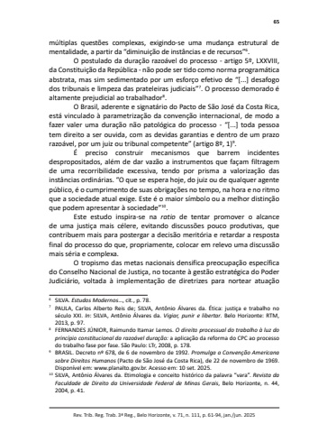 65Rev. Trib. Reg. Trab. 3ª Reg., Belo Horizonte, v. 71, n. 111, p. 61-94, jan./jun. 2025múltiplas questões complexas, exigindo-se uma mudança estrutural de mentalidade, a partir da “diminuição de instâncias e de recursos”6.O postulado da duração razoável do processo - artigo 5º, LXXVIII, da Constituição da República - não pode ser tido como norma programática abstrata, mas sim sedimentado por um esforço efetivo de “[...] desafogo dos tribunais e limpeza das prateleiras judiciais”7. O processo demorado é altamente prejudicial ao trabalhador8. O Brasil, aderente e signatário do Pacto de São José da Costa Rica, está vinculado à parametrização da convenção internacional, de modo a fazer valer uma duração não patológica do processo - “[...] toda pessoa tem direito a ser ouvida, com as devidas garantias e dentro de um prazo razoável, por um juiz ou tribunal competente” (artigo 8º, 1)9.É preciso construir mecanismos que barrem incidentes despropositados, além de dar vazão a instrumentos que façam filtragem de uma recorribilidade excessiva, tendo por prisma a valorização das instâncias ordinárias. “O que se espera hoje, do juiz ou de qualquer agente público, é o cumprimento de suas obrigações no tempo, na hora e no ritmo que a sociedade atual exige. Este é o maior símbolo ou a melhor distinção que podem apresentar à sociedade”10.Este estudo inspira-se na ratio de tentar promover o alcance de uma justiça mais célere, evitando discussões pouco produtivas, que contribuem mais para postergar a decisão meritória e retardar a resposta final do processo do que, propriamente, colocar em relevo uma discussão mais séria e complexa.O tropismo das metas nacionais densifica preocupação específica do Conselho Nacional de Justiça, no tocante à gestão estratégica do Poder Judiciário, voltada à implementação de diretrizes para nortear atuação 6 SILVA. Estudos Modernos…, cit., p. 78. 7 PAULA, Carlos Alberto Reis de; SILVA, Antônio Álvares da. Ética: justiça e trabalho no século XXI. In: SILVA, Antônio Álvares da. Vigiar, punir e libertar. Belo Horizonte: RTM, 2013, p. 97. 8 FERNANDES JÚNIOR, Raimundo Itamar Lemos. O direito processual do trabalho à luz do princípio constitucional da razoável duração: a aplicação da reforma do CPC ao processo do trabalho fase por fase. São Paulo: LTr, 2008, p. 178. 9 BRASIL. Decreto nº 678, de 6 de novembro de 1992. Promulga a Convenção Americana sobre Direitos Humanos (Pacto de São José da Costa Rica), de 22 de novembro de 1969. Disponível em: www.planalto.gov.br. Acesso em: 10 set. 2025. 10 SILVA, Antônio Álvares da. Etimologia e conceito histórico da palavra “vara”. Revista da Faculdade de Direito da Universidade Federal de Minas Gerais, Belo Horizonte, n. 44, 2004, p. 41.