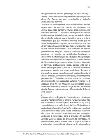 Rev. Trib. Reg. Trab. 3ª Reg., Belo Horizonte, v. 71, n. 111, p. 281-679, jan./jun. 2025651desigualdade no mundo. (Sentença de 20/10/2016).’Ainda, transcrevo parte de precedente paradigmático desta Eg. Turma, em que reconhecido o trabalho análogo ao de escravo:‘Trata-se da exploração de uma trabalhadora, mulher, negra, que, na verdade, diante dos contornos em que se deu, pode parecer a muitos algo comum, pela sua invisibilidade. O trabalho análogo à escravidão muitas vezes é invisível - tanto para a sociedade, diante da aceitação cultural, como também para o próprio trabalhador que, por receber o mínimo, ainda que em situação degradante, agradece e se submete a esse tipo de servidão, desconhecedor que é dos seus direitos - não só dos direitos trabalhistas - mas também de direitos fundamentais. De fato, ‘Sendo a atividade doméstica prestada no interior de residências familiares, a descoberta e a fiscalização de situações de exploração são bastante dificultadas e dependem, principalmente de ‘denúncias’ de pessoas próximas à vítima. Contudo, a barreira, praticamente física, parece não ser a única explicação para o fato de a servidão doméstica permanecer oculta em nossa sociedade. Somada a ela, pode-se supor elevado grau de aceitação cultural dessas práticas, que contribuem para, de certa forma, preservá-las.’ (Trabalho escravo: entre os achados da fiscalização e as respostas judiciais / Carlos H. B. Haddad, Lívia M. M. Miraglia (coordenação); Lucas Fernandes Monteiro, Marcela Rage Pereira, Marina de Araújo Bueno, colaboradores. - Florianópolis: Tribo da Ilha, 2018.)[...]Como esclarece Ângela de Castro Gomes, citada por Luciana Paula Conforti, in ‘Direito Fundamental de não ser Escravizado no Brasil’ (Belo Horizonte: RTM, 2022), ‘quando houve a revisão do art. 149 do Código Penal, a redação do dispositivo legal sofre críticas, em razão de não apresentar mais uma ‘visão conceitual restritiva’ do crime de manter trabalhadores em condições análogas à escravidão, com a previsão de punição, apenas, para os casos de privação da liberdade, em sentido estrito, como era em 1940. A tipificação aberta é entendida como falta de clareza na lei, alegando-se