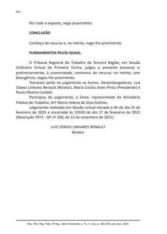 Rev. Trib. Reg. Trab. 3ª Reg., Belo Horizonte, v. 71, n. 111, p. 281-679, jan./jun. 2025654Por todo o exposto, nego provimento.CONCLUSÃOConheço do recurso e, no mérito, nego-lhe provimento.FUNDAMENTOS PELOS QUAIS,O Tribunal Regional do Trabalho da Terceira Região, em Sessão Ordinária Virtual da Primeira Turma, julgou o presente processo e, preliminarmente, à unanimidade, conheceu do recurso; no mérito, sem divergência, negou-lhe provimento.Tomaram parte no julgamento os Exmos. Desembargadores: Luiz Otávio Linhares Renault (Relator), Maria Cecília Alves Pinto (Presidente) e Paula Oliveira Cantelli.Participou do julgamento, a Exma. representante do Ministério Público do Trabalho, Drª Maria Helena da Silva Guthier.Julgamento realizado em Sessão virtual iniciada à 0h do dia 25 de fevereiro de 2025 e encerrada às 23h59 do dia 27 de fevereiro de 2025 (Resolução TRT3 - GP nº 208, de 12 de novembro de 2021).LUIZ OTÁVIO LINHARES RENAULTRelator