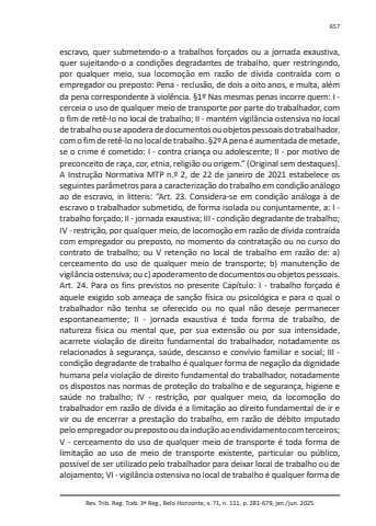 Rev. Trib. Reg. Trab. 3ª Reg., Belo Horizonte, v. 71, n. 111, p. 281-679, jan./jun. 2025657escravo, quer submetendo-o a trabalhos forçados ou a jornada exaustiva, quer sujeitando-o a condições degradantes de trabalho, quer restringindo, por qualquer meio, sua locomoção em razão de dívida contraída com o empregador ou preposto: Pena - reclusão, de dois a oito anos, e multa, além da pena correspondente à violência. §1º Nas mesmas penas incorre quem: I - cerceia o uso de qualquer meio de transporte por parte do trabalhador, com o fim de retê-lo no local de trabalho; II - mantém vigilância ostensiva no local de trabalho ou se apodera de documentos ou objetos pessoais do trabalhador, com o fim de retê-lo no local de trabalho. §2º A pena é aumentada de metade, se o crime é cometido: I - contra criança ou adolescente; II - por motivo de preconceito de raça, cor, etnia, religião ou origem.” (Original sem destaques). A Instrução Normativa MTP n.º 2, de 22 de janeiro de 2021 estabelece os seguintes parâmetros para a caracterização do trabalho em condição análogo ao de escravo, in litteris: “Art. 23. Considera-se em condição análoga à de escravo o trabalhador submetido, de forma isolada ou conjuntamente, a: I - trabalho forçado; II - jornada exaustiva; III - condição degradante de trabalho; IV - restrição, por qualquer meio, de locomoção em razão de dívida contraída com empregador ou preposto, no momento da contratação ou no curso do contrato de trabalho; ou V retenção no local de trabalho em razão de: a) cerceamento do uso de qualquer meio de transporte; b) manutenção de vigilância ostensiva; ou c) apoderamento de documentos ou objetos pessoais. Art. 24. Para os fins previstos no presente Capítulo: I - trabalho forçado é aquele exigido sob ameaça de sanção física ou psicológica e para o qual o trabalhador não tenha se oferecido ou no qual não deseje permanecer espontaneamente; II - jornada exaustiva é toda forma de trabalho, de natureza física ou mental que, por sua extensão ou por sua intensidade, acarrete violação de direito fundamental do trabalhador, notadamente os relacionados à segurança, saúde, descanso e convívio familiar e social; III - condição degradante de trabalho é qualquer forma de negação da dignidade humana pela violação de direito fundamental do trabalhador, notadamente os dispostos nas normas de proteção do trabalho e de segurança, higiene e saúde no trabalho; IV - restrição, por qualquer meio, da locomoção do trabalhador em razão de dívida é a limitação ao direito fundamental de ir e vir ou de encerrar a prestação do trabalho, em razão de débito imputado pelo empregador ou preposto ou da indução ao endividamento com terceiros; V - cerceamento do uso de qualquer meio de transporte é toda forma de limitação ao uso de meio de transporte existente, particular ou público, possível de ser utilizado pelo trabalhador para deixar local de trabalho ou de alojamento; VI - vigilância ostensiva no local de trabalho é qualquer forma de