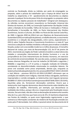 Rev. Trib. Reg. Trab. 3ª Reg., Belo Horizonte, v. 71, n. 111, p. 281-679, jan./jun. 2025658controle ou fiscalização, direta ou indireta, por parte do empregador ou preposto, sobre a pessoa do trabalhador que o impeça de deixar local de trabalho ou alojamento; e VII - apoderamento de documentos ou objetos pessoais é qualquer forma de posse ilícita do empregador ou preposto sobre documentos ou objetos pessoais do trabalhador.” (Original sem destaques). As referidas normas encontram ressonância na Declaração Universal dos Direitos do Homem, de 1948, na Convenção Suplementar das Nações Unidas sobre a Abolição da Escravidão, Tráfico de Escravos e Instituições e Práticas Semelhantes à Escravidão, de 1965, no Pacto Internacional dos Direitos Econômicos, Sociais e Culturais, de 1966 e no Pacto de São José da Costa Rica, de 1969. A Agenda 2030 da (ONU) tem por Objetivos de Desenvolvimento Sustentável (ODS) a erradicação da pobreza, o trabalho decente, o crescimento econômico e a redução das desigualdades, entre outros, especialmente o ODS 8, sobre Trabalho Decente e Crescimento Econômico e a meta 8.7 que menciona a adoção de medidas imediatas e eficazes para erradicar o trabalho forçado, acabar com a escravidão moderna e o tráfico de pessoas. O Conselho Nacional de Justiça, por meio da Recomendação 123, de 07 de janeiro de 2022, recomenda aos órgãos do Poder Judiciário brasileiro a observância dos tratados e convenções internacionais de direitos humanos e o uso da jurisprudência da Corte Interamericana de Direitos Humanos, em exercício do controle de convencionalidade. No caso dos autos, a própria empregadora anexou diversas fotografias do local de trabalho (Id 9612a46 e seguintes / 85bb06c e seguintes) e a 2ª ré juntou a inspeção realizada (Id 4c5bcb6), constatando as desconformidades relacionadas às condições laborais. Da prova oral acostada como prova emprestada, denoto que, enquanto as testemunhas indicadas pelo Autor (Srs. Írio - processo 001076537.2024.5.03.0145 e José Márcio - processo 0011511-42.2024.5.03.0067) afirmaram que as condições de trabalho eram indignas, havendo ônibus estragados, banheiros inapropriados e comida estragada, as testemunhas José Augusto (processo 0010893-57.2024.5.03.0145) e Leandro (processo 001072640.2024.5.03.0145), inquiridas pelas rés, forneceram declarações contrárias. Ocorre que a testemunha José Augusto demonstrou desconhecimento sobre detalhes das condições de trabalho, informando, por exemplo, que desconhecia as realidades dos ônibus, porque não era o responsável pela fiscalização nesses veículos. De outro lado, não são críveis as declarações da testemunha Leandro Silva da Cruz, pois informou que havia cerca de 29 a 31 banheiros disponíveis nas frentes do trabalho, os quais eram higienizados regularmente, o que contraria as informações constantes do relatório de fiscalização anexado aos autos pela 2ª demandada. Com efeito, é possível extrair do documento de Id