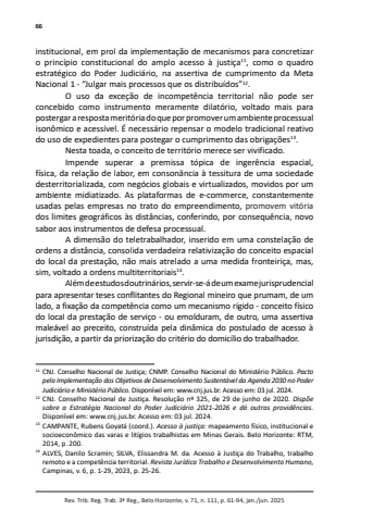 66Rev. Trib. Reg. Trab. 3ª Reg., Belo Horizonte, v. 71, n. 111, p. 61-94, jan./jun. 2025institucional, em prol da implementação de mecanismos para concretizar o princípio constitucional do amplo acesso à justiça11, como o quadro estratégico do Poder Judiciário, na assertiva de cumprimento da Meta Nacional 1 - “Julgar mais processos que os distribuídos”12.O uso da exceção de incompetência territorial não pode ser concebido como instrumento meramente dilatório, voltado mais para postergar a resposta meritória do que por promover um ambiente processual isonômico e acessível. É necessário repensar o modelo tradicional reativo do uso de expedientes para postegar o cumprimento das obrigações13.Nesta toada, o conceito de território merece ser vivificado.Impende superar a premissa tópica de ingerência espacial, física, da relação de labor, em consonância à tessitura de uma sociedade desterritorializada, com negócios globais e virtualizados, movidos por um ambiente midiatizado. As plataformas de e-commerce, constantemente usadas pelas empresas no trato do empreendimento, promovem vitóriados limites geográficos às distâncias, conferindo, por consequência, novo sabor aos instrumentos de defesa processual.A dimensão do teletrabalhador, inserido em uma constelação de ordens a distância, consolida verdadeira relativização do conceito espacial do local da prestação, não mais atrelado a uma medida fronteiriça, mas, sim, voltado a ordens multiterritoriais14.Além de estudos doutrinários, servir-se-á de um exame jurisprudencial para apresentar teses conflitantes do Regional mineiro que prumam, de um lado, a fixação da competência como um mecanismo rígido - conceito físico do local da prestação de serviço - ou emolduram, de outro, uma assertiva maleável ao preceito, construída pela dinâmica do postulado de acesso à jurisdição, a partir da priorização do critério do domicílio do trabalhador.11 CNJ. Conselho Nacional de Justiça; CNMP. Conselho Nacional do Ministério Público. Pacto pela Implementação dos Objetivos de Desenvolvimento Sustentável da Agenda 2030 no Poder Judiciário e Ministério Público. Disponível em: www.cnj.jus.br. Acesso em: 03 jul. 2024. 12 CNJ. Conselho Nacional de Justiça. Resolução nº 325, de 29 de junho de 2020. Dispõe sobre a Estratégia Nacional do Poder Judiciário 2021-2026 e dá outras providências. Disponível em: www.cnj.jus.br. Acesso em: 03 jul. 2024. 13 CAMPANTE, Rubens Goyatá (coord.). Acesso à justiça: mapeamento físico, institucional e socioeconômico das varas e litígios trabalhistas em Minas Gerais. Belo Horizonte: RTM, 2014, p. 200. 14 ALVES, Danilo Scramin; SILVA, Elissandra M. da. Acesso à Justiça do Trabalho, trabalho remoto e a competência territorial. Revista Jurídica Trabalho e Desenvolvimento Humano, Campinas, v. 6, p. 1-29, 2023, p. 25-26.