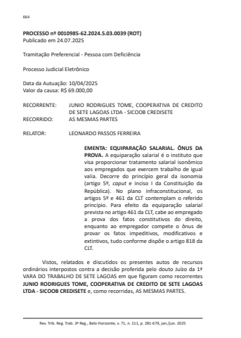 Rev. Trib. Reg. Trab. 3ª Reg., Belo Horizonte, v. 71, n. 111, p. 281-679, jan./jun. 2025664PROCESSO nº 0010985-62.2024.5.03.0039 (ROT)Publicado em 24.07.2025Tramitação Preferencial - Pessoa com DeficiênciaProcesso Judicial EletrônicoData da Autuação: 10/04/2025Valor da causa: R$ 69.000,00RECORRENTE: JUNIO RODRIGUES TOME, COOPERATIVA DE CREDITO DE SETE LAGOAS LTDA - SICOOB CREDISETERECORRIDO: AS MESMAS PARTESRELATOR: LEONARDO PASSOS FERREIRAEMENTA: EQUIPARAÇÃO SALARIAL. ÔNUS DA PROVA. A equiparação salarial é o instituto que visa proporcionar tratamento salarial isonômico aos empregados que exercem trabalho de igual valia. Decorre do princípio geral da isonomia (artigo 5º, caput e inciso I da Constituição da República). No plano infraconstitucional, os artigos 5º e 461 da CLT contemplam o referido princípio. Para efeito da equiparação salarial prevista no artigo 461 da CLT, cabe ao empregado a prova dos fatos constitutivos do direito, enquanto ao empregador compete o ônus de provar os fatos impeditivos, modificativos e extintivos, tudo conforme dispõe o artigo 818 da CLT.Vistos, relatados e discutidos os presentes autos de recursos ordinários interpostos contra a decisão proferida pelo douto Juízo da 1ª VARA DO TRABALHO DE SETE LAGOAS em que figuram como recorrentes JUNIO RODRIGUES TOME, COOPERATIVA DE CREDITO DE SETE LAGOAS LTDA - SICOOB CREDISETE e, como recorridas, AS MESMAS PARTES.