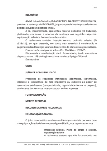 Rev. Trib. Reg. Trab. 3ª Reg., Belo Horizonte, v. 71, n. 111, p. 281-679, jan./jun. 2025665RELATÓRIOA MM. Juíza do Trabalho, Drª ANA CAROLINA PERETTI SCHLINDWEIN, prolatou a sentença de ID 5f9e674, julgando parcialmente procedentes os pedidos aduzidos na petição inicial.A ré, inconformada, apresentou recurso ordinário (ID 8612e0c), pleiteando, em suma, a reforma da sentença nos seguintes aspectos: equiparação salarial e honorários advocatícios.O reclamante também interpôs recurso ordinário adesivo (ID c323d1d), em que pretende, em suma, seja acrescida à condenação o pagamento das diferenças salariais decorrentes do plano de cargos e salários.Contrarrazões reciprocas sob os IDs. 30a64ba e 157fb85.Dispensada a manifestação da d. Procuradoria, tendo em vista o disposto no art. 129 do Regimento Interno deste Egrégio Tribunal.É o relatório.VOTOJUÍZO DE ADMISSIBILIDADEPresentes os requisitos intrínsecos (cabimento, legitimação, interesse e inexistência de fato impeditivo ou extintivo ao poder de recorrer) e extrínsecos (tempestividade, regularidade formal e preparo), conhece-se dos recursos interpostos por ambas as partes.FUNDAMENTAÇÃOMÉRITO RECURSALRECURSO DA PARTE RECLAMADAEQUIPARAÇÃO SALARIALO juízo monocrático acolheu as diferenças salariais por com base na equiparação salarial com o paradigma Gideão, nos seguintes termos:Diferenças salariais. Plano de cargos e salários. Equiparação SalarialO reclamante sustenta que não foi promovido aos