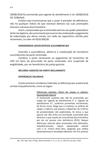 Rev. Trib. Reg. Trab. 3ª Reg., Belo Horizonte, v. 71, n. 111, p. 281-679, jan./jun. 202567428/08/2018 foi promovido para agente de atendimento II em 28/08/2018 (ID. 028b3ad).Embora seja incontroverso que o autor é portador de deficiência, não há qualquer indício de que eventual demora nas suas promoções tivessem natureza discriminatória.Assim, comprovado que a reclamada exerceu seu poder potestativo de forma legítima, dou provimento para excluir da condenação o pagamento de indenização por danos morais, em razão do capacitismo sofrido pelo reclamante, no valor de R$10.000,00.HONORÁRIOS ADVOCATÍCIOS SUCUMBENCIAISInvertida a sucumbência, afasta-se a condenação de honorários sucumbenciais da parte reclamada.Condeno a parte reclamante ao pagamento de honorários de 10% em favor do procurador da parte reclamada, com suspensão de exigibilidade, por ser beneficiário da justiça gratuita.RECURSO ADESIVO DA PARTE RECLAMANTEDIFERENÇAS SALARIAISO juízo primevo considerou indevidas as diferenças por ausência de correto enquadramento, como se segue:Diferenças salariais. Plano de cargos e salários. Equiparação SalarialO reclamante sustenta que não foi promovido aos cargos de “agente de atendimento II” e “agente de atendimento III”, conforme prometido inicialmente, de forma anual. Alega que a mudança na política de cargos e salários, que passou a depender de critérios de produtividade não explicitados, foi lesiva e que apenas ele não tinha sua promoção autorizada pela diretoria, o que reputa ser uma atitude discriminatória por ele ser pessoa com deficiência (PCD). Requer diferenças salariais pelas promoções não efetivadas. Subsidiariamente, requer equiparação salarial com o Sr. Vinício Brito Reis, alegando que ambos desempenhavam atividades idênticas. Por fim, postula