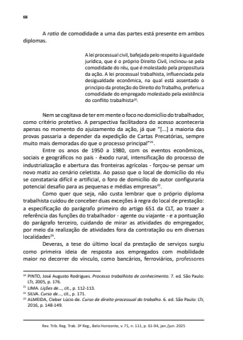 68Rev. Trib. Reg. Trab. 3ª Reg., Belo Horizonte, v. 71, n. 111, p. 61-94, jan./jun. 2025A ratio de comodidade a uma das partes está presente em ambos diplomas.A lei processual civil, bafejada pelo respeito à igualdade jurídica, que é o próprio Direito Civil, inclinou-se pela comodidade do réu, que é molestado pela propositura da ação. A lei processual trabalhista, influenciada pela desigualdade econômica, na qual está assentado o princípio da proteção do Direito do Trabalho, preferiu a comodidade do empregado molestado pela existência do conflito trabalhista20.Nem se cogitava de ter em mente o foco no domicílio do trabalhador, como critério protetivo. A perspectiva facilitadora do acesso aconteceria apenas no momento do ajuizamento da ação, já que “[...] a maioria das provas passaria a depender da expedição de Cartas Precatórias, sempre muito mais demoradas do que o processo principal”21.Entre os anos de 1950 a 1980, com os eventos econômicos, sociais e geográficos no país - êxodo rural, intensificação do processo de industrialização e abertura das fronteiras agrícolas - forçou-se pensar um novo matiz ao cenário celetista. Ao passo que o local de domicílio do réu se constataria difícil e artificial, o foro de domicílio do autor configuraria potencial desafio para as pequenas e médias empresas22.Como quer que seja, não custa lembrar que o próprio diploma trabalhista cuidou de conceber duas exceções à regra do local de prestação: a especificação do parágrafo primeiro do artigo 651 da CLT, ao trazer a referência das funções do trabalhador - agente ou viajante - e a pontuação do parágrafo terceiro, cuidando de mirar as atividades do empregador, por meio da realização de atividades fora da contratação ou em diversas localidades23.Deveras, a tese do último local da prestação de serviços surgiu como primeira ideia de resposta aos empregados com mobilidade maior no decorrer do vínculo, como bancários, ferroviários, professores 20 PINTO, José Augusto Rodrigues. Processo trabalhista de conhecimento. 7. ed. São Paulo: LTr, 2005, p. 176. 21 LIMA. Lições de…, cit., p. 112-113. 22 SILVA. Curso de…, cit., p. 171. 23 ALMEIDA, Cleber Lúcio de. Curso de direito processual do trabalho. 6. ed. São Paulo: LTr, 2016, p. 148-149.
