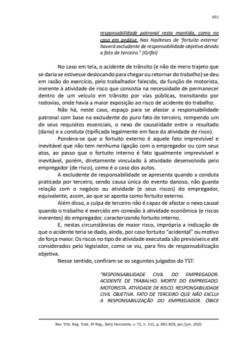 Rev. Trib. Reg. Trab. 3ª Reg., Belo Horizonte, v. 71, n. 111, p. 681-828, jan./jun. 2025691responsabilidade patronal resta mantida, como no caso em análise. Nas hipóteses de ‘fortuito externo’ haverá excludente de responsabilidade objetiva devido a fato de terceiro.” (Grifei)No caso em tela, o acidente de trânsito (e não de mero trajeto que se daria se estivesse deslocando para chegar ou retornar do trabalho) se deu em razão do exercício, pelo trabalhador falecido, da função de motorista, inerente à atividade de risco que consistia na necessidade de permanecer dentro de um veículo em trânsito por vias públicas, transitando por rodovias, onde havia a maior exposição ao risco de acidente do trabalho.Não há, neste caso, espaço para se afastar a responsabilidade patronal com base na excludente do puro fato de terceiro, rompendo um de seus requisitos essenciais, o nexo de causalidade entre o resultado (dano) e a conduta (tipificada legalmente em face da atividade de risco).Pondera-se que o fortuito externo é aquele fato imprevisível e inevitável que não tem nenhuma ligação com o empregador ou com seus atos, ao passo que o fortuito interno é fato igualmente imprevisível e inevitável, porém, diretamente vinculado à atividade desenvolvida pelo empregador (de risco), como é o caso dos autos.A excludente de responsabilidade se apresenta quando a conduta praticada por terceiro, sendo causa única do evento danoso, não guarda relação com o negócio ou atividade (e seus riscos) do empregador, equivalente, assim, ao que se aponta como fortuito externo.Além disso, a culpa de terceiro não é capaz de afastar o nexo causal quando o trabalho é exercido em conexão à atividade econômica (e riscos inerentes) do empregador, caracterizando fortuito interno.E, nestas circunstâncias de maior risco, imprópria a indicação de que o acidente teria se dado, ainda, por caso fortuito “acidental” ou motivo de força maior. Os riscos no tipo de atividade executada são previsíveis e até considerados pelo legislador, como se viu, para fins de responsabilização objetiva.Nesse sentido, confiram-se os seguintes julgados do TST:“RESPONSABILIDADE CIVIL DO EMPREGADOR. ACIDENTE DE TRABALHO. MORTE DO EMPREGADO. MOTORISTA. ATIVIDADE DE RISCO. RESPONSABILIDADE CIVIL OBJETIVA. FATO DE TERCEIRO QUE NÃO EXCLUI A RESPONSABILIZAÇÃO DO EMPREGADOR. ÓBICE