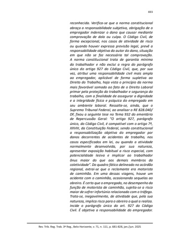 Rev. Trib. Reg. Trab. 3ª Reg., Belo Horizonte, v. 71, n. 111, p. 681-828, jan./jun. 2025693reconhecida. Verifica-se que a norma constitucional abraça a responsabilidade subjetiva, obrigação de o empregador indenizar o dano que causar mediante comprovação de dolo ou culpa. O Código Civil, de forma excepcional, nos casos de atividade de risco ou quando houver expressa previsão legal, prevê a responsabilidade objetiva do autor do dano, situação em que não se faz necessária tal comprovação. A norma constitucional trata de garantia mínima do trabalhador e não exclui a regra do parágrafo único do artigo 927 do Código Civil, que, por sua vez, atribui uma responsabilidade civil mais ampla ao empregador, aplicável de forma supletiva ao Direito do Trabalho, haja vista o princípio da norma mais favorável somado ao fato de o Direito Laboral primar pela proteção do trabalhador e segurança do trabalho, com a finalidade de assegurar a dignidade e a integridade física e psíquica do empregado em seu ambiente laboral. Ressalte-se, ainda, que o Supremo Tribunal Federal, ao analisar o RE 828.040/DF, fixou a seguinte tese no Tema 932 do ementário de Repercussão Geral: “O artigo 927, parágrafo único, do Código Civil, é compatível com o artigo 7º, XXVIII, da Constituição Federal, sendo constitucional a responsabilização objetiva do empregador por danos decorrentes de acidentes de trabalho, nos casos especificados em lei, ou quando a atividade normalmente desenvolvida, por sua natureza, apresentar exposição habitual a risco especial, com potencialidade lesiva e implicar ao trabalhador ônus maior do que aos demais membros da coletividade”. Do quadro fático delineado no acórdão regional, extrai-se que o reclamante era motorista de caminhão. Em uma dessas viagens, houve um acidente com o caminhão, ocasionando sequelas ao obreiro. É certo que o empregado, no desempenho da função de motorista de caminhão, sujeita-se a risco maior de sofrer infortúnio relacionado com o tráfego. Trata-se, inegavelmente, de atividade que, pela sua natureza, implica risco para o obreiro o qual a realiza. Incide o parágrafo único do art. 927 do Código Civil. É objetiva a responsabilidade do empregador.