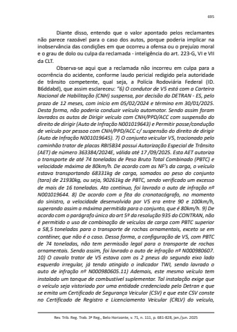 Rev. Trib. Reg. Trab. 3ª Reg., Belo Horizonte, v. 71, n. 111, p. 681-828, jan./jun. 2025695Diante disso, entendo que o valor apontado pelos reclamantes não parece razoável para o caso dos autos, porque poderia implicar na inobservância das condições em que ocorreu a ofensa ou o prejuízo moral e o grau de dolo ou culpa da reclamada - inteligência do art. 223-G, VI e VII da CLT.Observa-se aqui que a reclamada não incorreu em culpa para a ocorrência do acidente, conforme laudo pericial redigido pela autoridade de trânsito competente, qual seja, a Polícia Rodoviária Federal (ID. B6ddabd), que assim esclareceu: “6) O condutor de V5 está com a Carteira Nacional de Habilitação (CNH) suspensa, por decisão do DETRAN - ES, pelo prazo de 12 meses, com início em 05/02/2024 e término em 30/01/2025. Desta forma, não poderia conduzir veículo automotor. Sendo assim foram lavrados os autos de Dirigir veículo com CNH/PPD/ACC com suspensão do direito de dirigir (Auto de Infração N001019643) e Permitir posse/condução de veículo por pessoa com CNH/PPD/ACC c/ suspensão do direito de dirigir (Auto de Infração N001019645). 7) O conjunto veicular V5, tracionado pelo caminhão trator de placas RBI5B34 possui Autorização Especial de Trânsito (AET) de número 363384/2024E, válida até 17 /09/2025. Esta AET autoriza o transporte de até 74 toneladas de Peso Bruto Total Combinado (PBTC) e velocidade máxima de 80km/h. De acordo com as NF’s da carga, o veículo estava transportando 68331kg de carga, somados ao peso do conjunto (tara) de 21930kg, ou seja, 90261kg de PBTC, sendo verificado um excesso de mais de 16 toneladas. Ato contínuo, foi lavrado o auto de infração nº N001019644. 8) De acordo com a fita do cronotacógrafo, no momento do sinistro, a velocidade desenvolvida por V5 era entre 90 e 100km/h, superando assim a máxima permitida para o conjunto, que é 80km/h. 9) De acordo com o parágrafo único do art 5º da resolução 935 do CONTRAN, não é permitido o uso de combinação de veículos de carga com PBTC superior a 58,5 toneladas para o transporte de rochas ornamentais, exceto se em contêiner, que não é o caso. Dessa forma, a configuração de V5, com PBTC de 74 toneladas, não tem permissão legal para o transporte de rochas ornamentais. Sendo assim, foi lavrado o auto de infração nº N000980607. 10) O cavalo trator de V5 estava com os 2 pneus do segundo eixo lado esquerdo irregular, já tendo atingido o indicador TWI, sendo lavrado o auto de infração nº N000980605.11) Ademais, este mesmo veículo tem instalado um tanque de combustível suplementar. Tal instalação exige que o veículo seja vistoriado por uma entidade credenciada pelo Detran e que se emita um Certificado de Segurança Veicular (CSV) e que este CSV conste no Certificado de Registro e Licenciamento Veicular (CRLV) do veículo,