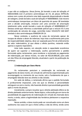 Rev. Trib. Reg. Trab. 3ª Reg., Belo Horizonte, v. 71, n. 111, p. 681-828, jan./jun. 2025696o que não se configurou. Dessa forma, foi lavrado o auto de infração nº N001019646.112) O primeiro semirreboque de V5, de placas NFP5C29, estava com o pneu do primeiro eixo lado esquerdo desprendendo a banda de rodagem, sendo lavrado o auto de infração nº N000980603. Este mesmo semirreboque transportava um bloco de quartzito de quase 38 toneladas sem a devida amarração, inclusive com uma corrente de amarração totalmente solta, sendo lavrado o auto de infração nº N000980603.13”. Destaco ainda que informou a autoridade policial que o veículo V5 é uma combinação de veículos de carga, caminhão trator VOLVO/FH 540 6X4T atrelado a dois semirreboques RANDON SR CA.Nesse contexto, a ausência de culpa da reclamada apesar de incapaz de afastar o dever de indenizar, haja vista o acolhimento pelo juízo da responsabilidade objetiva, deve ser sopesada para fim de arbitramento do valor indenizatória, já que afasta o efeito punitiva, restando então apenas o aspecto reparatório.Ante todo exposto, em atenção ainda à capacidade econômica de quem vai suportar a indenização, acolho parcialmente o pedido formulado pelos reclamantes, para condenar a reclamada ao pagamento de indenização, por danos morais, no valor de R$120.000,00, para cada um dos filhos do empregado falecido, atualizável a partir da publicação da sentença.2) Indenização por Dano MorteOs reclamantes postulam a condenação da reclamada ao pagamento de dano morte, em virtude do sofrimento experimentado pelo ex-empregado no momento de sua morte, sob o fundamento de que o empregado falecido teve seu direito à vida violado.Em sede de defesa, a reclamada afirma que o pedido formulado é juridicamente impossível, uma vez que os direitos à personalidade extinguem-se com a morte, não havendo direito à personalidade garantido após a morte da pessoa.Inicialmente, cumpre ressaltar que o direito pleiteado difere-se do direito pleiteado anteriormente. Neste tópico, a discussão gira em torno da possibilidade de pagamento de indenização em virtude do chamado dano morte, e ainda, sobre a legitimidade dos herdeiros pleitearem a respectiva reparação.Nesse sentido, o dano morte pode ser conceituado como um dano autônomo nos casos em que o ilícito ceifou a vida da vítima, tendo como