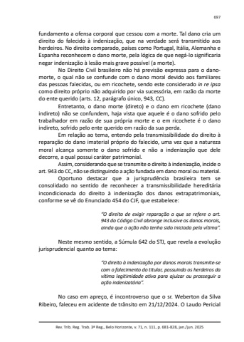 Rev. Trib. Reg. Trab. 3ª Reg., Belo Horizonte, v. 71, n. 111, p. 681-828, jan./jun. 2025697fundamento a ofensa corporal que cessou com a morte. Tal dano cria um direito do falecido à indenização, que na verdade será transmitido aos herdeiros. No direito comparado, países como Portugal, Itália, Alemanha e Espanha reconhecem o dano morte, pela lógica de que negá-lo significaria negar indenização à lesão mais grave possível (a morte).No Direito Civil brasileiro não há previsão expressa para o danomorte, o qual não se confunde com o dano moral devido aos familiares das pessoas falecidas, ou em ricochete, sendo este considerado in re ipsacomo direito próprio não adquirido por via sucessória, em razão da morte do ente querido (arts. 12, parágrafo único, 943, CC).Entretanto, o dano morte (direto) e o dano em ricochete (dano indireto) não se confundem, haja vista que aquele é o dano sofrido pelo trabalhador em razão de sua própria morte e o em ricochete é o dano indireto, sofrido pelo ente querido em razão da sua perda.Em relação ao tema, entendo pela transmissibilidade do direito à reparação do dano imaterial próprio do falecido, uma vez que a natureza moral alcança somente o dano sofrido e não a indenização que dele decorre, a qual possui caráter patrimonial.Assim, considerando que se transmite o direito à indenização, incide o art. 943 do CC, não se distinguindo a ação fundada em dano moral ou material.Oportuno destacar que a jurisprudência brasileira tem se consolidado no sentido de reconhecer a transmissibilidade hereditária incondicionada do direito à indenização dos danos extrapatrimoniais, conforme se vê do Enunciado 454 do CJF, que estabelece:“O direito de exigir reparação a que se refere o art. 943 do Código Civil abrange inclusive os danos morais, ainda que a ação não tenha sido iniciada pela vítima”.Neste mesmo sentido, a Súmula 642 do STJ, que revela a evolução jurisprudencial quanto ao tema:“O direito à indenização por danos morais transmite-se com o falecimento do titular, possuindo os herdeiros da vítima legitimidade ativa para ajuizar ou prosseguir a ação indenizatória”.No caso em apreço, é incontroverso que o sr. Weberton da Silva Ribeiro, faleceu em acidente de trânsito em 21/12/2024. O Laudo Pericial