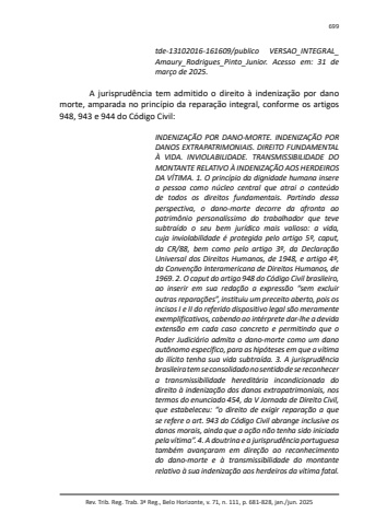 Rev. Trib. Reg. Trab. 3ª Reg., Belo Horizonte, v. 71, n. 111, p. 681-828, jan./jun. 2025699tde-13102016-161609/publico VERSAO_INTEGRAL_Amaury_Rodrigues_Pinto_Junior. Acesso em: 31 de março de 2025.A jurisprudência tem admitido o direito à indenização por dano morte, amparada no princípio da reparação integral, conforme os artigos 948, 943 e 944 do Código Civil:INDENIZAÇÃO POR DANO-MORTE. INDENIZAÇÃO POR DANOS EXTRAPATRIMONIAIS. DIREITO FUNDAMENTAL À VIDA. INVIOLABILIDADE. TRANSMISSIBILIDADE DO MONTANTE RELATIVO À INDENIZAÇÃO AOS HERDEIROS DA VÍTIMA. 1. O princípio da dignidade humana insere a pessoa como núcleo central que atrai o conteúdo de todos os direitos fundamentais. Partindo dessa perspectiva, o dano-morte decorre da afronta ao patrimônio personalíssimo do trabalhador que teve subtraído o seu bem jurídico mais valioso: a vida, cuja inviolabilidade é protegida pelo artigo 5º, caput, da CR/88, bem como pelo artigo 3º, da Declaração Universal dos Direitos Humanos, de 1948, e artigo 4º, da Convenção Interamericana de Direitos Humanos, de 1969. 2. O caput do artigo 948 do Código Civil brasileiro, ao inserir em sua redação a expressão “sem excluir outras reparações”, instituiu um preceito aberto, pois os incisos I e II do referido dispositivo legal são meramente exemplificativos, cabendo ao intérprete dar-lhe a devida extensão em cada caso concreto e permitindo que o Poder Judiciário admita o dano-morte como um dano autônomo específico, para as hipóteses em que a vítima do ilícito tenha sua vida subtraída. 3. A jurisprudência brasileira tem se consolidado no sentido de se reconhecer a transmissibilidade hereditária incondicionada do direito à indenização dos danos extrapatrimoniais, nos termos do enunciado 454, da V Jornada de Direito Civil, que estabeleceu: “o direito de exigir reparação a que se refere o art. 943 do Código Civil abrange inclusive os danos morais, ainda que a ação não tenha sido iniciada pela vítima”. 4. A doutrina e a jurisprudência portuguesa também avançaram em direção ao reconhecimento do dano-morte e à transmissibilidade do montante relativo à sua indenização aos herdeiros da vítima fatal.