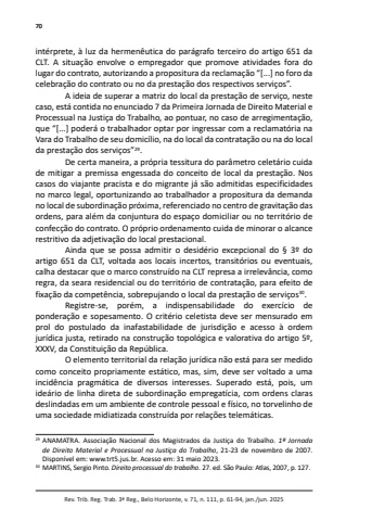 70Rev. Trib. Reg. Trab. 3ª Reg., Belo Horizonte, v. 71, n. 111, p. 61-94, jan./jun. 2025intérprete, à luz da hermenêutica do parágrafo terceiro do artigo 651 da CLT. A situação envolve o empregador que promove atividades fora do lugar do contrato, autorizando a propositura da reclamação “[...] no foro da celebração do contrato ou no da prestação dos respectivos serviços”.A ideia de superar a matriz do local da prestação de serviço, neste caso, está contida no enunciado 7 da Primeira Jornada de Direito Material e Processual na Justiça do Trabalho, ao pontuar, no caso de arregimentação, que “[...] poderá o trabalhador optar por ingressar com a reclamatória na Vara do Trabalho de seu domicílio, na do local da contratação ou na do local da prestação dos serviços”29.De certa maneira, a própria tessitura do parâmetro celetário cuida de mitigar a premissa engessada do conceito de local da prestação. Nos casos do viajante pracista e do migrante já são admitidas especificidades no marco legal, oportunizando ao trabalhador a propositura da demanda no local de subordinação próxima, referenciado no centro de gravitação das ordens, para além da conjuntura do espaço domiciliar ou no território de confecção do contrato. O próprio ordenamento cuida de minorar o alcance restritivo da adjetivação do local prestacional.Ainda que se possa admitir o desidério excepcional do § 3º do artigo 651 da CLT, voltada aos locais incertos, transitórios ou eventuais, calha destacar que o marco construído na CLT represa a irrelevância, como regra, da seara residencial ou do território de contratação, para efeito de fixação da competência, sobrepujando o local da prestação de serviços30.Registre-se, porém, a indispensabilidade do exercício de ponderação e sopesamento. O critério celetista deve ser mensurado em prol do postulado da inafastabilidade de jurisdição e acesso à ordem jurídica justa, retirado na construção topológica e valorativa do artigo 5º, XXXV, da Constituição da República.O elemento territorial da relação jurídica não está para ser medido como conceito propriamente estático, mas, sim, deve ser voltado a uma incidência pragmática de diversos interesses. Superado está, pois, um ideário de linha direta de subordinação empregatícia, com ordens claras deslindadas em um ambiente de controle pessoal e físico, no torvelinho de uma sociedade midiatizada construída por relações telemáticas.29 ANAMATRA. Associação Nacional dos Magistrados da Justiça do Trabalho. 1ª Jornada de Direito Material e Processual na Justiça do Trabalho, 21-23 de novembro de 2007. Disponível em: www.trt5.jus.br. Acesso em: 31 maio 2023. 30 MARTINS, Sergio Pinto. Direito processual do trabalho. 27. ed. São Paulo: Atlas, 2007, p. 127.