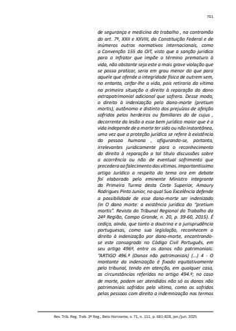 Rev. Trib. Reg. Trab. 3ª Reg., Belo Horizonte, v. 71, n. 111, p. 681-828, jan./jun. 2025701de segurança e medicina do trabalho , na contramão do art. 7º, XXII e XXVIII, da Constituição Federal e de inúmeros outros normativos internacionais, como a Convenção 155 da OIT, visto que a sanção jurídica para o infrator que impõe o término prematuro à vida, não obstante seja este a mais grave violação que se possa praticar, seria em grau menor do que para aquele que ofende a integridade física de outrem sem, no entanto, ceifar-lhe a vida, pois retiraria da vítima na primeira situação o direito à reparação do dano extrapatrimonial adicional que sofrera. Desse modo, o direito à indenização pelo dano-morte (pretium mortis), autônomo e distinto dos prejuízos de afeição sofridos pelos herdeiros ou familiares do de cujus , decorrente da lesão a esse bem jurídico maior que é a vida independe de a morte ter sido ou não instantânea, uma vez que a proteção jurídica se refere à existência da pessoa humana , afigurando-se, portanto, irrelevantes juridicamente para o reconhecimento do direito à reparação a tal título discussões sobre a ocorrência ou não de eventual sofrimento que precedera ao falecimento das vítimas. Importantíssimo artigo Jurídico a respeito do tema ora em debate foi elaborado pelo eminente Ministro integrante da Primeira Turma desta Corte Superior, Amaury Rodrigues Pinto Junior, no qual Sua Excelência defende a possibilidade de esse dano-morte ser indenizado (in O dano morte: a existência jurídica do “pretium mortis”. Revista do Tribunal Regional do Trabalho da 24ª Região, Campo Grande, n. 20, p. 39-60, 2015). É cediço, ainda, que tanto a doutrina e a jurisprudência portuguesas, como sua legislação, reconhecem o direito à indenização por dano-morte, encontrandose este consagrado no Código Civil Português, em seu artigo 496º, entre os danos não patrimoniais: “ARTIGO 496.º (Danos não patrimoniais) (...) 4 - O montante da indenização é fixado equitativamente pelo tribunal, tendo em atenção, em qualquer caso, as circunstâncias referidas no artigo 494.º; no caso de morte, podem ser atendidos não só os danos não patrimoniais sofridos pela vítima, como os sofridos pelas pessoas com direito a indemnização nos termos