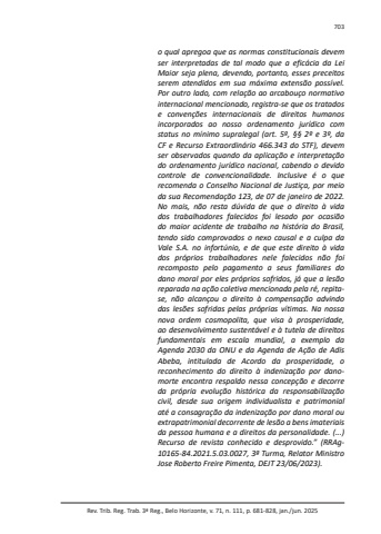 Rev. Trib. Reg. Trab. 3ª Reg., Belo Horizonte, v. 71, n. 111, p. 681-828, jan./jun. 2025703o qual apregoa que as normas constitucionais devem ser interpretadas de tal modo que a eficácia da Lei Maior seja plena, devendo, portanto, esses preceitos serem atendidos em sua máxima extensão possível. Por outro lado, com relação ao arcabouço normativo internacional mencionado, registra-se que os tratados e convenções internacionais de direitos humanos incorporados ao nosso ordenamento jurídico com status no mínimo supralegal (art. 5º, §§ 2º e 3º, da CF e Recurso Extraordinário 466.343 do STF), devem ser observados quando da aplicação e interpretação do ordenamento jurídico nacional, cabendo o devido controle de convencionalidade. Inclusive é o que recomenda o Conselho Nacional de Justiça, por meio da sua Recomendação 123, de 07 de janeiro de 2022. No mais, não resta dúvida de que o direito à vida dos trabalhadores falecidos foi lesado por ocasião do maior acidente de trabalho na história do Brasil, tendo sido comprovados o nexo causal e a culpa da Vale S.A. no infortúnio, e de que este direito à vida dos próprios trabalhadores nele falecidos não foi recomposto pelo pagamento a seus familiares do dano moral por eles próprios sofridos, já que a lesão reparada na ação coletiva mencionada pela ré, repitase, não alcançou o direito à compensação advindo das lesões sofridas pelas próprias vítimas. Na nossa nova ordem cosmopolita, que visa à prosperidade, ao desenvolvimento sustentável e à tutela de direitos fundamentais em escala mundial, a exemplo da Agenda 2030 da ONU e da Agenda de Ação de Adis Abeba, intitulada de Acordo da prosperidade, o reconhecimento do direito à indenização por danomorte encontra respaldo nessa concepção e decorre da própria evolução histórica da responsabilização civil, desde sua origem individualista e patrimonial até a consagração da indenização por dano moral ou extrapatrimonial decorrente de lesão a bens imateriais da pessoa humana e a direitos da personalidade. (...) Recurso de revista conhecido e desprovido.” (RRAg10165-84.2021.5.03.0027, 3ª Turma, Relator Ministro Jose Roberto Freire Pimenta, DEJT 23/06/2023).