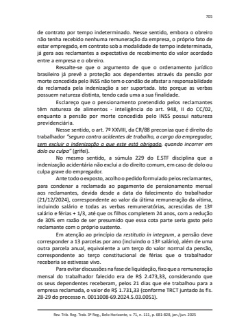 Rev. Trib. Reg. Trab. 3ª Reg., Belo Horizonte, v. 71, n. 111, p. 681-828, jan./jun. 2025705de contrato por tempo indeterminado. Nesse sentido, embora o obreiro não tenha recebido nenhuma remuneração da empresa, o próprio fato de estar empregado, em contrato sob a modalidade de tempo indeterminada, já gera aos reclamantes a expectativa de recebimento do valor acordado entre a empresa e o obreiro.Ressalte-se que o argumento de que o ordenamento jurídico brasileiro já prevê a proteção aos dependentes através da pensão por morte concedida pelo INSS não tem o condão de afastar a responsabilidade da reclamada pela indenização a ser suportada. Isto porque as verbas possuem natureza distinta, tendo cada uma a sua finalidade.Esclareço que o pensionamento pretendido pelos reclamantes têm natureza de alimentos - inteligência do art. 948, II do CC/02, enquanto a pensão por morte concedida pelo INSS possui natureza previdenciária.Nesse sentido, o art. 7º XXVIII, da CR/88 preconiza que é direito do trabalhador “seguro contra acidentes de trabalho, a cargo do empregador, sem excluir a indenização a que este está obrigado, quando incorrer em dolo ou culpa” (grifei).No mesmo sentido, a súmula 229 do E.STF disciplina que a indenização acidentária não exclui a do direito comum, em caso de dolo ou culpa grave do empregador.Ante todo o exposto, acolho o pedido formulado pelos reclamantes, para condenar a reclamada ao pagamento de pensionamento mensal aos reclamantes, devida desde a data do falecimento do trabalhador (21/12/2024), correspondente ao valor da última remuneração da vítima, incluindo salário e todas as verbas remuneratórias, acrescidas de 13º salário e férias + 1/3, até que os filhos completem 24 anos, com a redução de 30% em razão de ser presumido que essa cota parte seria gasto pelo reclamante com o próprio sustento.Em atenção ao princípio da restitutio in integrum, a pensão deve corresponder a 13 parcelas por ano (incluindo o 13º salário), além de uma outra parcela anual, equivalente a um terço do valor normal da pensão, correspondente ao terço constitucional de férias que o trabalhador receberia se estivesse vivo.Para evitar discussões na fase de liquidação, fixo que a remuneração mensal do trabalhador falecido era de R$ 2.473,33, considerando que os seus dependentes receberam, pelos 21 dias que ele trabalhou para a empresa reclamada, o valor de R$ 1.731,33 (conforme TRCT juntado às fls. 28-29 do processo n. 0011008-69.2024.5.03.0051).