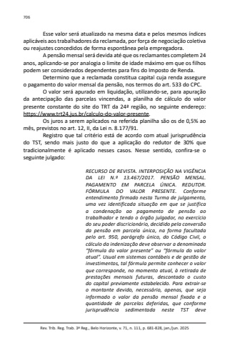 Rev. Trib. Reg. Trab. 3ª Reg., Belo Horizonte, v. 71, n. 111, p. 681-828, jan./jun. 2025706Esse valor será atualizado na mesma data e pelos mesmos índices aplicáveis aos trabalhadores da reclamada, por força de negociação coletiva ou reajustes concedidos de forma espontânea pela empregadora.A pensão mensal será devida até que os reclamantes completem 24 anos, aplicando-se por analogia o limite de idade máximo em que os filhos podem ser considerados dependentes para fins do Imposto de Renda.Determino que a reclamada constitua capital cuja renda assegure o pagamento do valor mensal da pensão, nos termos do art. 533 do CPC.O valor será apurado em liquidação, utilizando-se, para apuração da antecipação das parcelas vincendas, a planilha de cálculo do valor presente constante do site do TRT da 24ª região, no seguinte endereço: https://www.trt24.jus.br/calculo-do-valor-presente.Os juros a serem aplicados na referida planilha são os de 0,5% ao mês, previstos no art. 12, II, da Lei n. 8.177/91.Registro que tal critério está de acordo com atual jurisprudência do TST, sendo mais justo do que a aplicação do redutor de 30% que tradicionalmente é aplicado nesses casos. Nesse sentido, confira-se o seguinte julgado:RECURSO DE REVISTA. INTERPOSIÇÃO NA VIGÊNCIA DA LEI N.º 13.467/2017. PENSÃO MENSAL. PAGAMENTO EM PARCELA ÚNICA. REDUTOR. FÓRMULA DO VALOR PRESENTE. Conforme entendimento firmado nesta Turma de julgamento, uma vez identificada situação em que se justifica a condenação ao pagamento de pensão ao trabalhador e tendo o órgão julgador, no exercício do seu poder discricionário, decidido pela conversão da pensão em parcela única, na forma facultada pelo art. 950, parágrafo único, do Código Civil, o cálculo da indenização deve observar a denominada “fórmula do valor presente” ou “fórmula do valor atual”. Usual em sistemas contábeis e de gestão de investimentos, tal fórmula permite conhecer o valor que corresponde, no momento atual, à retirada de prestações mensais futuras, descontado o custo do capital previamente estabelecido. Para extrair-se o montante devido, necessário, apenas, que seja informado o valor da pensão mensal fixada e a quantidade de parcelas deferidas, que conforme jurisprudência sedimentada neste TST deve