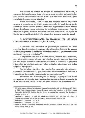 71Rev. Trib. Reg. Trab. 3ª Reg., Belo Horizonte, v. 71, n. 111, p. 61-94, jan./jun. 2025No tocante ao critério de fixação da competência territorial, o processo do trabalho deve fazer valer uma seara acessível ao trabalhador, para discutir seus direitos e trazer à tona sua demanda, alimentada pelo postulado de maior acesso à justiça31.Neste quadrante, como enlace das relações sociais, imperioso resgatar o conceito de território. A compreensão do local da prestação de serviço revela-se uma premissa maleável, ingrediente de trato menos rígido, densificado numa sociedade de mobilidade intensa, com fluxo de trabalhos fugazes, ecoados mediante contatos telemáticos. As regras de fixação da competência trabalhista não podem ignorar a evolução social.3. DESTERRITORIALIZAÇÃO DO TRABALHO: POR UM NOVO CONCEITO DO LOCAL DA PRESTAÇÃO DE SERVIÇOA dinâmica dos processos de globalização promove um novo espectro das dimensões de espaço, intensificando a fluência de lugares diversos, fragilizando as fronteiras. A vida está imersa “[...] numa mobilidade constante, concreta e simbólica”32.A impressão é de que o mundo parece, mesmo, estar encolhido, com dimensões menos rígidas. As relações sociais fazem-se inseridas em um amplo contexto intensificado de redes a distância. A premissa integradora do território exige um olhar múltiplo e atento aos elementos de poder no espaço33.Territorializar significa criar mediações espaciais intensificadas, voltadas a um ambiente “[...] multiescalar e multidimensional, material e imaterial, de dominação e apropriação ao mesmo tempo”34.Percebida nas manifestações do espaço, a geografia do poder compreende a interação dos atores sociais, componentes de um conjunto rico e indissociável de um sistema de ações, imbuído de artificialidades35.31 SCHIAVI, Mauro. Manual de direito processual do trabalho. 13. ed. São Paulo: LTr, 2018, p. 326; FAVA, Marcos Neves. Competência da Justiça do Trabalho. In: THOME, Candy Florencio; SCHWARZ, Rodrigo Garcia. Direito processual do trabalho. Rio de Janeiro: Elsevier, 2011, p. 6. 32 HAESBAERT, Rogério. O mito da desterritorialização: do “fim dos territórios” à multiterritorialidade. 10. ed. Rio de Janeiro: Bertrand Brasil, 2016, p. 20. 33 HAESBAERT. O mito da…, cit., p. 79. 34 HAESBAERT. O mito da…, cit., p. 97. 35 SANTOS, Milton. A natureza do espaço: técnica e tempo, razão e emoção. 4. ed. São Paulo: Edusp, 2006, p. 39.