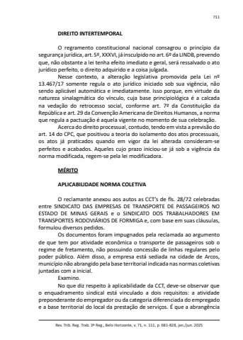 Rev. Trib. Reg. Trab. 3ª Reg., Belo Horizonte, v. 71, n. 111, p. 681-828, jan./jun. 2025711DIREITO INTERTEMPORALO regramento constitucional nacional consagrou o princípio da segurança jurídica, art. 5º, XXXVI, já insculpido no art. 6º da LINDB, prevendo que, não obstante a lei tenha efeito imediato e geral, será ressalvado o ato jurídico perfeito, o direito adquirido e a coisa julgada.Nesse contexto, a alteração legislativa promovida pela Lei nº 13.467/17 somente regula o ato jurídico iniciado sob sua vigência, não sendo aplicável automática e imediatamente. Isso porque, em virtude da natureza sinalagmática do vínculo, cuja base principiológica é a calcada na vedação do retrocesso social, conforme art. 7º da Constituição da República e art. 29 da Convenção Americana de Direitos Humanos, a norma que regula a pactuação é aquela vigente no momento de sua celebração.Acerca do direito processual, contudo, tendo em vista a previsão do art. 14 do CPC, que positivou a teoria do isolamento dos atos processuais, os atos já praticados quando em vigor da lei alterada consideram-se perfeitos e acabados. Aqueles cujo prazo iniciou-se já sob a vigência da norma modificada, regem-se pela lei modificadora.MÉRITOAPLICABILIDADE NORMA COLETIVAO reclamante anexou aos autos as CCT’s de fls. 28/72 celebradas entre SINDICATO DAS EMPRESAS DE TRANSPORTE DE PASSAGEIROS NO ESTADO DE MINAS GERAIS e o SINDICATO DOS TRABALHADORES EM TRANSPORTES RODOVIÁRIOS DE FORMIGA e, com base em suas cláusulas, formulou diversos pedidos.Os documentos foram impugnados pela reclamada ao argumento de que tem por atividade econômica o transporte de passageiros sob o regime de fretamento, não possuindo concessão de linhas regulares pelo poder público. Além disso, a empresa está sediada na cidade de Arcos, município não abrangido pela base territorial indicada nas normas coletivas juntadas com a inicial.Examino.No que diz respeito à aplicabilidade da CCT, deve-se observar que o enquadramento sindical está vinculado a dois requisitos: a atividade preponderante do empregador ou da categoria diferenciada do empregado e a base territorial do local da prestação de serviços. É que a abrangência